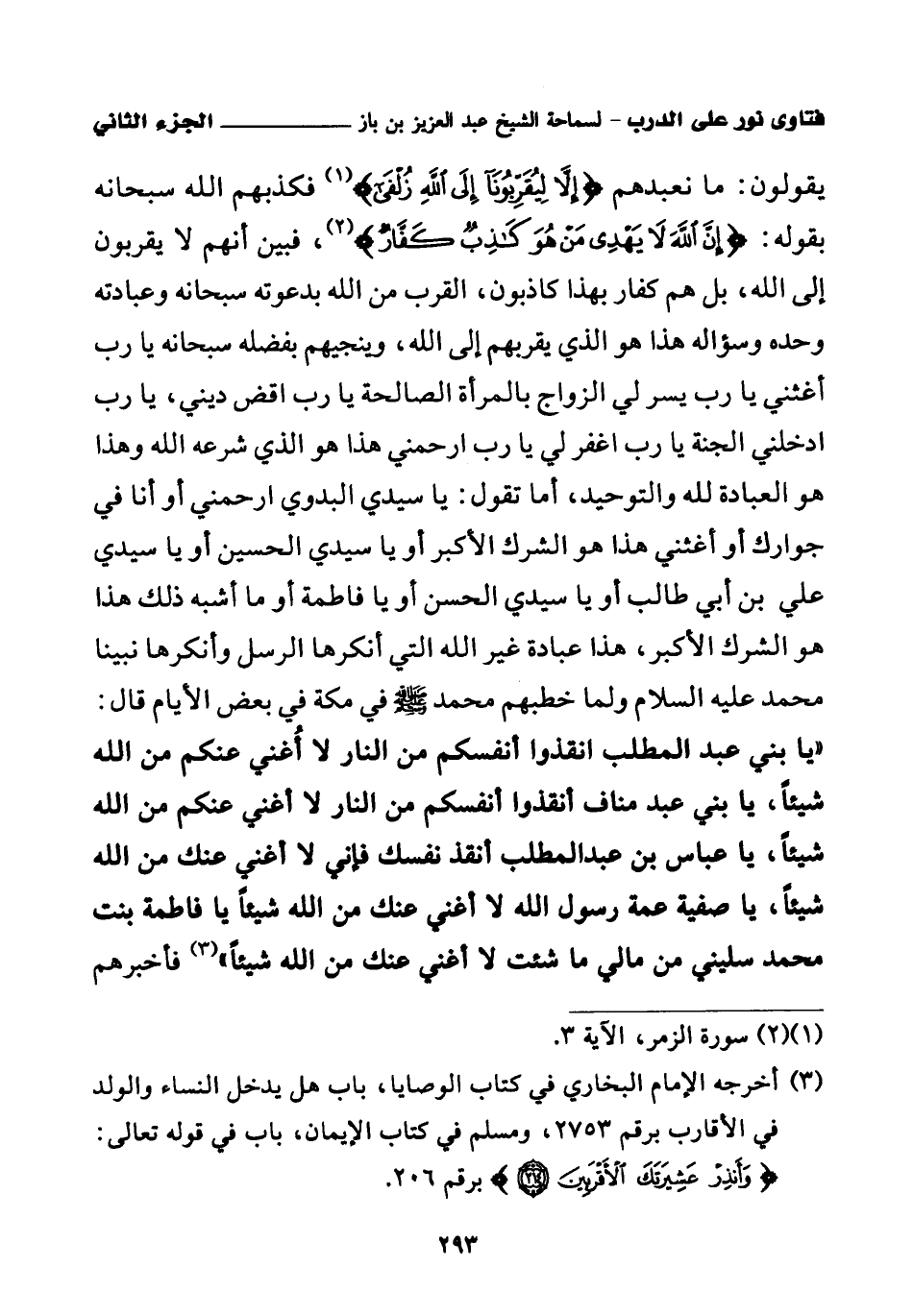 يقولون: ما نعبدهم {إِلَّا لِيُقَرِّبُونَا إِلَى اللَّهِ زُلْفَى} (¬1) فكذبهم الله سبحانه بقوله: {إِنَّ اللَّهَ لَا يَهْدِي مَنْ هُوَ كَاذِبٌ كَفَّارٌ} (¬2)، فبين أنهم لا يقربون إلى الله، بل هم كفار بهذا كاذبون، القرب من الله بدعوته سبحانه وعبادته وحده وسؤاله، هذا هو الذي يقربهم إلى الله، وينجيهم بفضله سبحانه، يا رب أغثني يا رب يسر لي الزواج بالمرأة الصالحة يا رب اقض ديني، يا رب أدخلني الجنة يا رب اغفر لي يا رب ارحمني هذا هو الذي شرعه الله، وهذا هو العبادة لله والتوحيد، أما تقول: يا سيدي البدوي ارحمني أو أنا في جوارك أو أغثني هذا هو الشرك الأكبر أو يا سيدي الحسين أو يا سيدي علي بن أبي طالب أو يا سيدي الحسن أو يا فاطمة أو ما أشبه ذلك، هذا هو الشرك الأكبر، هذا عبادة غير الله التي أنكرها الرسل وأنكرها نبينا محمد عليه السلام.