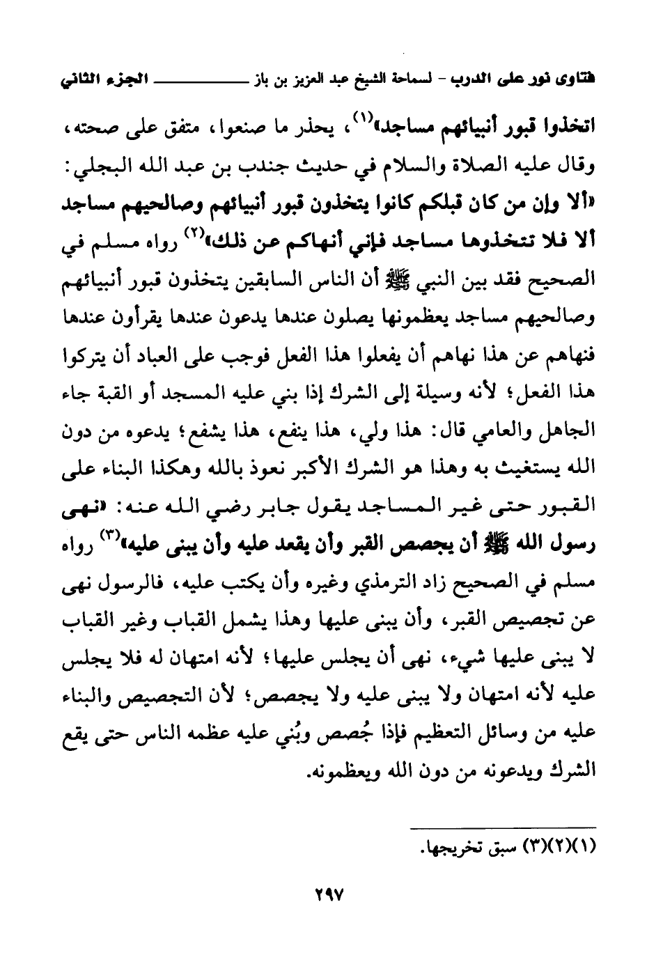 اتخذوا قبور أنبيائهم مساجد (¬1)»، يحذر ما صنعوا، متفق على صحته، وقال عليه الصلاة والسلام في حديث جندب بن عبد الله البجلي: «ألا وإن من كان قبلكم كانوا يتخذون قبور أنبيائهم وصالحيهم مساجد ألا فلا تتخذوها مساجد فإني أنهاكم عن ذلك (¬2)» رواه مسلم في الصحيح فقد بين النبي صلى الله عليه وسلم أن الناس السابقين يتخذون قبور أنبيائهم وصالحيهم مساجد يعظمونها يصلون عندها يدعون عندها يقرأون عندها فنهاهم عن هذا، نهاهم أن يفعلوا هذا الفعل، فوجب على العباد أن يتركوا هذا الفعل؛ لأنه وسيلة إلى الشرك إذا بني عليه المسجد أو القبة جاء الجاهل والعامي قال: هذا ولي، هذا ينفع، هذا يشفع؛ يدعوه من دون الله يستغيث به، وهذا هو الشرك الأكبر نعوذ بالله، وهكذا البناء على القبور حتى غير المساجد؛ يقول جابر رضي الله عنه: «نهى رسول الله صلى الله عليه وسلم أن يجصص القبر وأن يقعد عليه وأن يبنى عليه (¬3)» رواه مسلم في الصحيح زاد الترمذي وغيره وأن يكتب عليه، فالرسول نهى عن تجصيص القبر، وأن يبنى عليها وهذا يشمل القباب وغير القباب لا يبنى عليها شيء، نهى أن يجلس عليها؛ لأنه امتهان له فلا يجلس عليه لأنه امتهان ولا يبنى عليه ولا يجصص؛ لأن التجصيص والبناء عليه من وسائل التعظيم، فإذا جصص وبني عليه عظمه الناس حتى يقع الشرك ويدعونه من دون الله ويعظمونه.