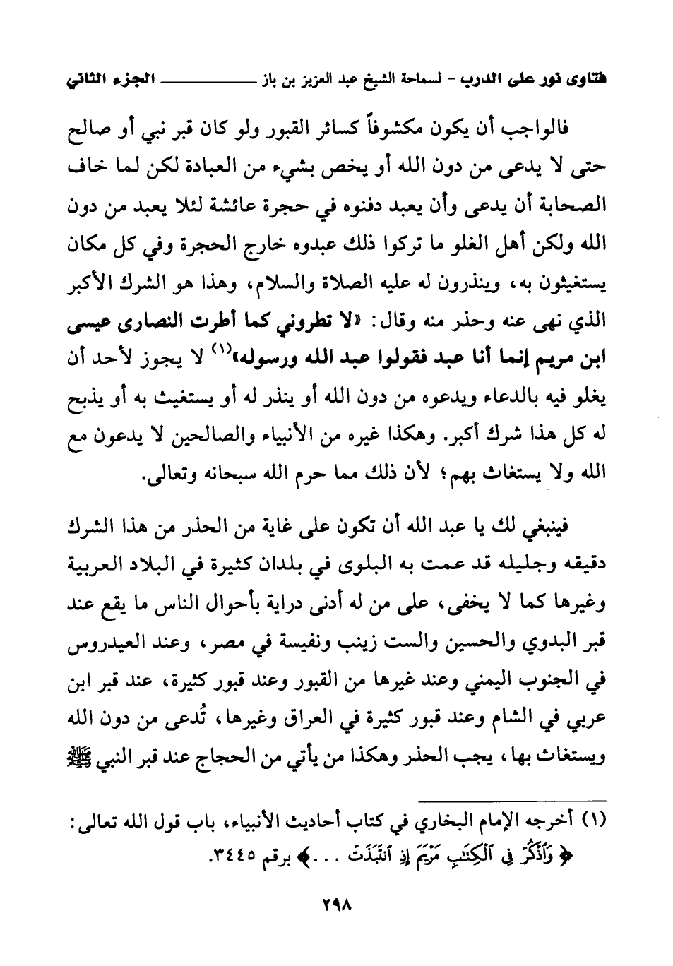 فالواجب أن يكون مكشوفا كسائر القبور ولو كان قبر نبي أو صالح حتى لا يدعى من دون الله أو يخص بشيء من العبادة لكن لما خاف الصحابة أن يدعى وأن يعبد دفنوه في حجرة عائشة لئلا يعبد من دون الله ولكن أهل الغلو ما تركوا ذلك، عبدوه خارج الحجرة وفي كل مكان يستغيثون به، وينذرون له عليه الصلاة والسلام، وهذا هو الشرك الأكبر الذي نهى عنه وحذر منه وقال: «لا تطروني كما أطرت النصارى عيسى ابن مريم إنما أنا عبد فقولوا عبد الله ورسوله (¬1)» لا يجوز لأحد أن يغلو فيه بالدعاء ويدعوه من دون الله أو ينذر له أو يستغيث به أو يذبح له كل هذا شرك أكبر. وهكذا غيره من الأنبياء والصالحين لا يدعون مع الله ولا يستغاث بهم؛ لأن ذلك مما حرم الله سبحانه وتعالى.
