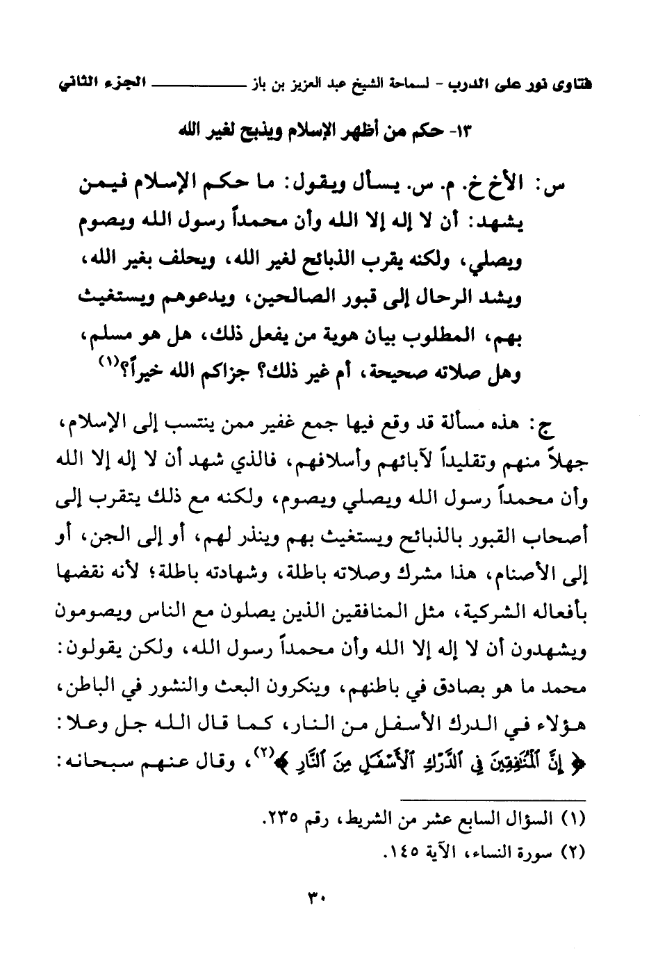 ج: هذه مسألة قد وقع فيها جمع غفير ممن ينتسب إلى الإسلام، جهلا منهم وتقليدا لآبائهم وأسلافهم، فالذي شهد أن لا إله إلا الله وأن محمدا رسول الله ويصلي ويصوم، ولكنه مع ذلك يتقرب إلى أصحاب القبور بالذبائح ويستغيث بهم وينذر لهم، أو إلى الجن، أو إلى الأصنام، هذا مشرك وصلاته باطلة، وشهادته باطلة؛ لأنه نقضها بأفعاله الشركية، مثل المنافقين الذين يصلون مع الناس ويصومون ويشهدون أن لا إله إلا الله وأن محمدا رسول الله، ولكن يقولون: محمد ما هو بصادق في باطنهم، وينكرون البعث والنشور في الباطن، هؤلاء في الدرك الأسفل من النار، كما قال الله جل وعلا: {إِنَّ الْمُنَافِقِينَ فِي الدَّرْكِ الْأَسْفَلِ مِنَ النَّارِ} (¬2)، وقال عنهم سبحانه: