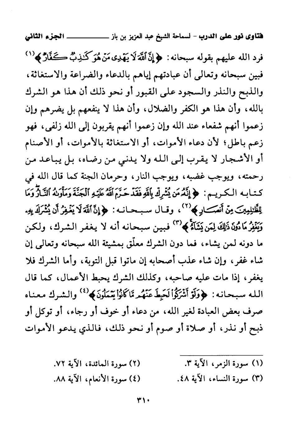 فرد الله عليهم بقوله سبحانه: {إِنَّ اللَّهَ لَا يَهْدِي مَنْ هُوَ كَاذِبٌ كَفَّارٌ} (¬1) فبين سبحانه وتعالى أن عبادتهم إياهم بالدعاء والضراعة والاستغاثة، والذبح والنذر والسجود على القبور أو نحو ذلك أن هذا هو الشرك بالله، وأن هو الكفر والضلال، وأن هذا لا ينفعهم بل يضرهم وإن زعموا أنهم شفعاء عند الله وإن زعموا أنهم يقربون إلى الله زلفى، فهو زعم باطل؛ لأن دعاء الأموات، أو الاستغاثة بالأموات، أو الأصنام أو الأشجار لا يقرب إلى الله ولا يدني من رضاه، بل يباعد من رحمته، ويوجب غضبه، ويوجب النار، وحرمان الجنة كما قال الله في كتابه الكريم: {إِنَّهُ مَنْ يُشْرِكْ بِاللَّهِ فَقَدْ حَرَّمَ اللَّهُ عَلَيْهِ الْجَنَّةَ وَمَأْوَاهُ النَّارُ وَمَا لِلظَّالِمِينَ مِنْ أَنْصَارٍ} (¬2)، وقال سبحانه: {إِنَّ اللَّهَ لَا يَغْفِرُ أَنْ يُشْرَكَ بِهِ وَيَغْفِرُ مَا دُونَ ذَلِكَ لِمَنْ يَشَاءُ} (¬3) فبين سبحانه أنه لا يغفر الشرك، ولكن ما دونه لمن يشاء، فما دون الشرك معلق بمشيئة الله سبحانه وتعالى إن شاء غفر، وإن شاء عذب أصحابه إن ماتوا قبل التوبة، وأما الشرك فلا يغفر، إذا مات عليه صاحبه، وكذلك الشرك يحبط الأعمال، كما قال الله سبحانه: {وَلَوْ أَشْرَكُوا لَحَبِطَ عَنْهُمْ مَا كَانُوا يَعْمَلُونَ} (¬4)، والشرك معناه صرف بعض العبادة لغير الله، من دعاء أو خوف أو رجاء، أو توكل أو ذبح أو نذر، أو صلاة أو صوم أو نحو ذلك، فالذي يدعو الأموات