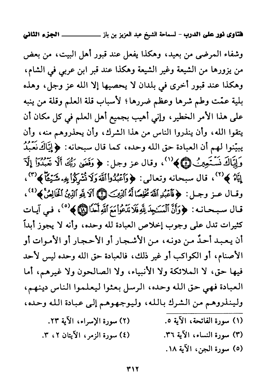 وشفاء المرضى من بعيد، وهكذا يفعل عند قبور أهل البيت من بعض من يزورها من الشيعة وغير الشيعة وهكذا عند قبر ابن عربي في الشام، وهكذا عند قبور أخرى في بلدان لا يحصيها إلا الله عز وجل، وهذه بلية عمت وطم شرها وعظم ضررها؛ لأسباب قلة العلم وقلة من ينبه على هذا الأمر الخطير، وإني أهيب بجميع أهل العلم في كل مكان أن يتقوا الله، وأن ينذروا الناس من هذا الشرك، وأن يحذروهم منه، وأن يبينوا لهم أن العبادة حق الله وحده، كما قال سبحانه: {إِيَّاكَ نَعْبُدُ وَإِيَّاكَ نَسْتَعِينُ} (¬1)، وقال عز جل: {وَقَضَى رَبُّكَ أَلَّا تَعْبُدُوا إِلَّا إِيَّاهُ} (¬2)، قال سبحانه وتعالى: {وَاعْبُدُوا اللَّهَ وَلَا تُشْرِكُوا بِهِ شَيْئًا} (¬3) وقال عز وجل: {فَاعْبُدِ اللَّهَ مُخْلِصًا لَهُ الدِّينَ} (¬4) {أَلَا لِلَّهِ الدِّينُ الْخَالِصُ} (¬5)؛ قال سبحانه: {وَأَنَّ الْمَسَاجِدَ لِلَّهِ فَلَا تَدْعُوا مَعَ اللَّهِ أَحَدًا} (¬6)، في آيات كثيرات تدل على وجوب إخلاص العبادة لله وحده، وأنه لا يجوز أبدا أن يعبد أحد من دونه، من الأشجار أو الأحجار أو الأموات أو الأصنام، أو الكواكب أو غير ذلك، فالعبادة حق الله وحده ليس لأحد فيها حق، لا الملائكة ولا الأنبياء، ولا الصالحون ولا غيرهم، أما العبادة فهي حق الله وحده، الرسل بعثوا ليعلموا الناس دينهم، ولينذروهم من الشرك بالله، وليوجهوهم إلى عبادة الله وحده،