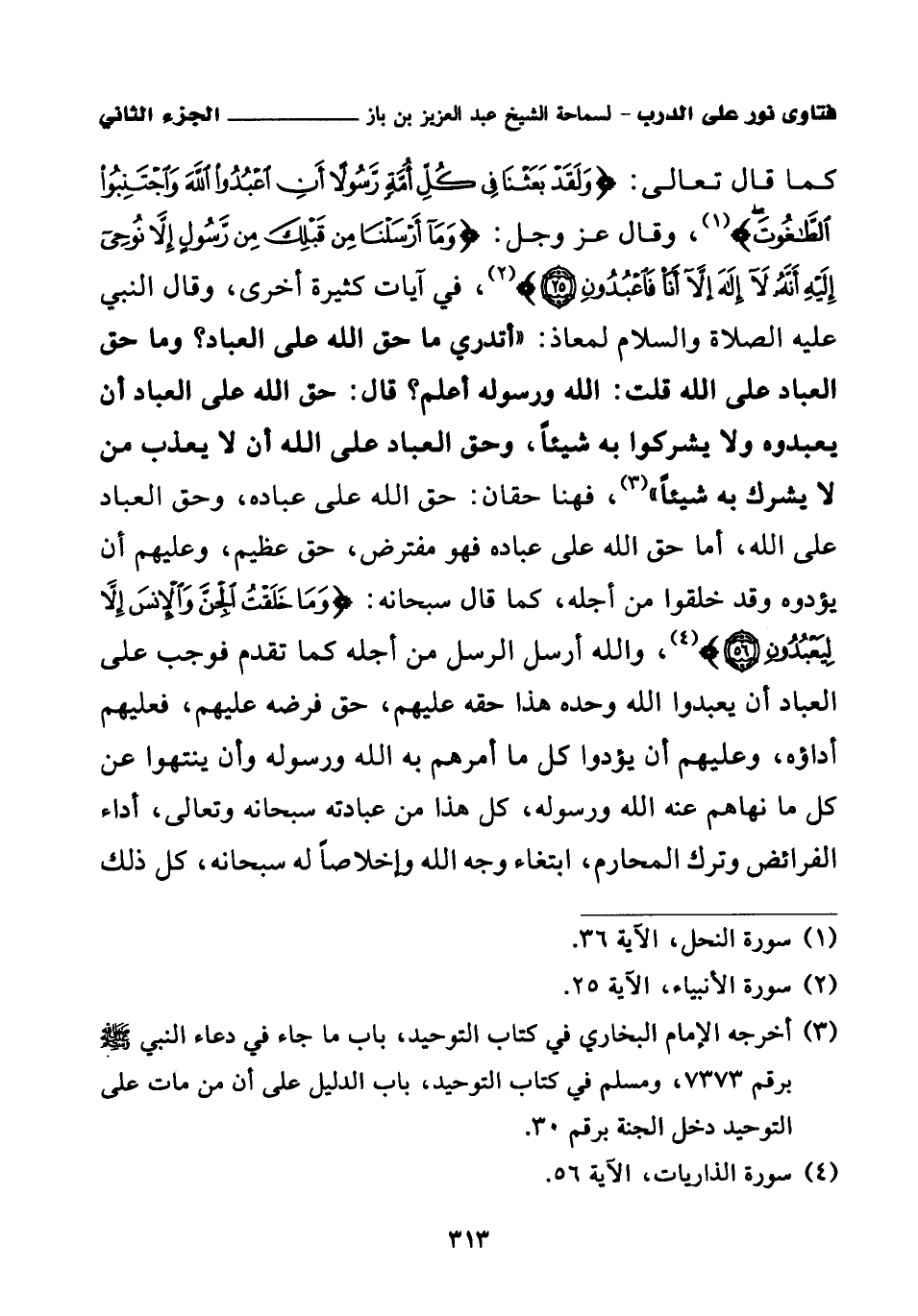 كما قال تعالى: {وَلَقَدْ بَعَثْنَا فِي كُلِّ أُمَّةٍ رَسُولًا أَنِ اُعْبُدُوا اللَّهَ وَاجْتَنِبُوا الطَّاغُوتَ} (¬1)، وقال عز وجل: {وَمَا أَرْسَلْنَا مِنْ قَبْلِكَ مِنْ رَسُولٍ إِلَّا نُوحِي إِلَيْهِ أَنَّهُ لَا إِلَهَ إِلَّا أَنَا فَاعْبُدُونِ} (¬2)، في آيات كثيرة أخرى، وقال النبي عليه الصلاة والسلام لمعاذ: «أتدري ما حق الله على العباد؟ وما حق العباد على الله؟ قلت: الله ورسوله أعلم؛ قال: حق الله على العباد أن يعبدوه ولا يشركوا به شيئا، وحق العباد على الله أن لا يعذب من لا يشرك به شيئا (¬3)»، فهنا حقان: حق الله على عباده، وحق العباد على الله، أما حق الله على عباده فهو مفترض، حق عظيم، وعليهم أن يؤدوه وقد خلقوا من أجله، كما قال سبحانه: {وَمَا خَلَقْتُ الْجِنَّ وَالْإِنْسَ إِلَّا لِيَعْبُدُونِ} (¬4) والله أرسل الرسل من أجله كما تقدم فوجب على العباد أن يعبدوا الله وحده هذا حقه عليهم، حق فرضه عليهم، فعليهم أداؤه، وعليهم أن يؤدوا كل ما أمرهم به الله ورسوله وأن ينتهوا عن كل ما نهاهم عنه الله ورسوله، كل هذا من عبادته سبحانه وتعالى، أداء الفرائض وترك المحارم، ابتغاء وجه الله وإخلاصا له سبحانه، كل ذلك