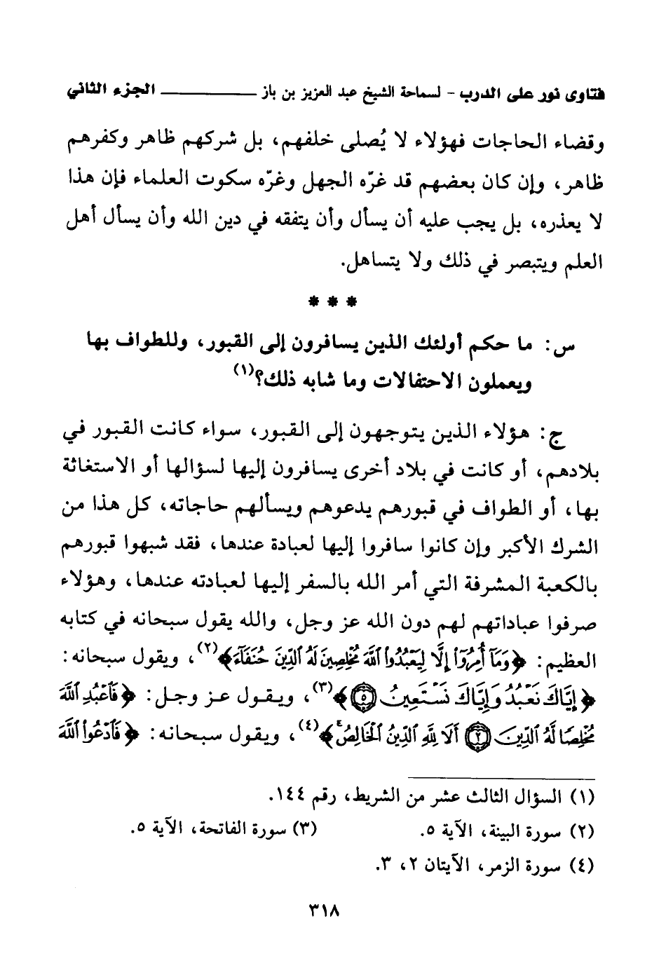 ج: هؤلاء الذين يتوجهون إلى القبور، سواء كانت القبور في بلادهم، أو كانت في بلاد أخرى يسافرون إليها لسؤالها أو الاستغاثة بها، أو الطواف في قبورهم يدعوهم ويسألهم حاجاته، كل هذا من الشرك الأكبر وإن كانوا سافروا إليها لعبادة عندها، فقد شبهوا قبورهم بالكعبة المشرفة التي أمر الله بالسفر إليها لعبادته عندها، وهؤلاء صرفوا عباداتهم لهم دون الله عز وجل، والله يقول سبحانه في كتابه العظيم: {وَمَا أُمِرُوا إِلَّا لِيَعْبُدُوا اللَّهَ مُخْلِصِينَ لَهُ الدِّينَ حُنَفَاءَ} (¬2) ويقول سبحانه: {إِيَّاكَ نَعْبُدُ وَإِيَّاكَ نَسْتَعِينُ} (¬3)، ويقول عز وجل: {فَاعْبُدِ اللَّهَ مُخْلِصًا لَهُ الدِّينَ} (¬4) {أَلَا لِلَّهِ الدِّينُ الْخَالِصُ} (¬5)، ويقول سبحانه: