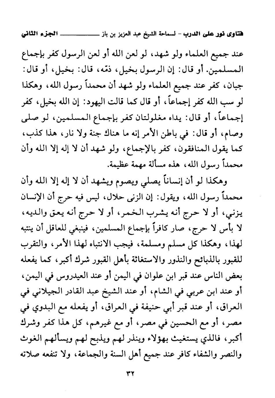 وهكذا لو أن إنسانا يصلي ويصوم ويشهد أن لا إله إلا الله وأن محمدا رسول الله، ويقول: إن الزنى حلال، ليس فيه حرج أن الإنسان يزني، أو لا حرج أنه يشرب الخمر، أو لا حرج أنه يعق والديه، لا بأس لا حرج، صار كافرا بإجماع المسلمين، فينبغي للعاقل أن ينتبه لهذا، وهكذا كل مسلم ومسلمة، فيجب الانتباه لهذا الأمر، والتقرب للقبور بالذبائح والنذور والاستغاثة بأهل القبور شرك أكبر، كما يفعله بعض الناس عند قبر ابن علوان في اليمن أو عند العيدروس في اليمن، أو عند ابن عربي في الشام، أو عند الشيخ عبد القادر الجيلاني في العراق، أو عند قبر أبي حنيفة في العراق، أو يفعله مع البدوي في مصر، أو مع الحسين في مصر، أو مع غيرهم، كل هذا كفر وشرك أكبر، فالذي يستغيث بهؤلاء وينذر لهم ويذبح لهم ويسألهم الغوث والنصر والشفاء كافر عند جميع أهل السنة والجماعة، ولا تنفعه صلاته
