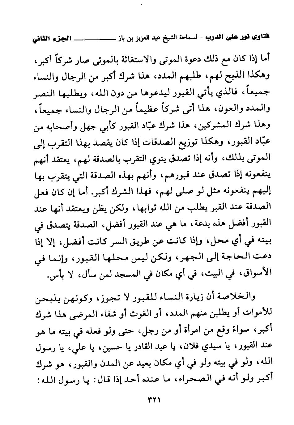 أما إذا كان مع ذلك دعوة الموتى والاستغاثة بالموتى صار شركا أكبر، وهكذا الذبح لهم، طلبهم المدد، هذا شرك أكبر من الرجال والنساء جميعا، فالذي يأتي القبور ليدعوها من دون الله، ويطلبها النصر والمدد والعون، هذا أتى شركا عظيما من الرجال والنساء جميعا، وهذا شرك المشركين، هذا شرك عباد القبور كأبي جهل وأصحابه من عباد القبور، وهكذا توزيع الصدقات إذا كان يقصد بهذا التقرب إلى الموتى بذلك، وأنه إذا تصدق ينوي التقرب بالصدقة لهم، يعتقد أنهم ينفعونه إذا تصدق عند قبورهم، وأنهم بهذه الصدقة التي يتقرب بها إليهم ينفعونه مثل لو صلى لهم، فهذا الشرك أكبر. أما إن كان فعل الصدقة عند القبر يطلب من الله ثوابها، ولكن يظن ويعتقد أنها عند القبور أفضل هذه بدعة، ما هي عند القبور أفضل، الصدقة يتصدق في بيته في أي محل، وإذا كانت عن طريق السر كانت أفضل، إلا إذا دعت الحاجة إلى الجهر، ولكن ليس محلها القبور، وإنما في الأسواق، في البيت، في أي مكان في المسجد لمن سأل، لا بأس.