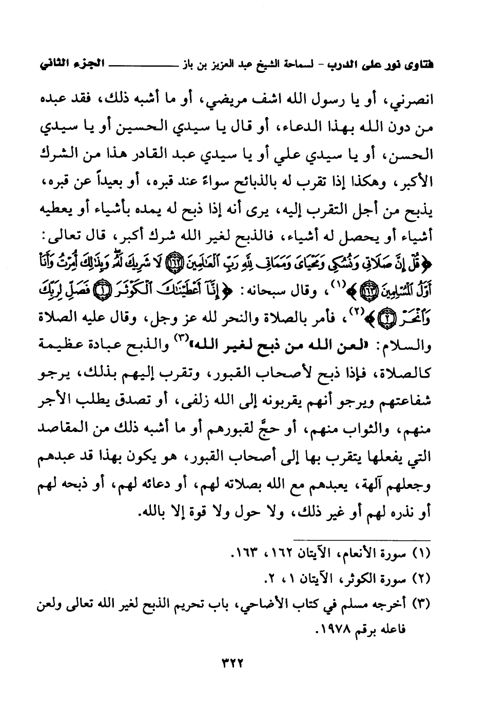 انصرني، أو يا رسول الله اشف مريضي، أو ما أشبه ذلك، فقد عبده من دون الله بهذا الدعاء، أو قال يا سيدي الحسين أو يا سيدي الحسن، أو يا سيدي علي، أو يا سيدي عبد القادر هذا من الشرك الأكبر، وهكذا إذا تقرب بالذبائح سواء عند قبره، أو بعيدا عن قبره، يذبح من أجل التقرب إليه، يرى أنه إذا ذبح له يمده بأشياء أو يعطيه أشياء أو يحصل له أشياء، فالذبح لغير الله شرك أكبر، قال تعالى: {قُلْ إِنَّ صَلَاتِي وَنُسُكِي وَمَحْيَايَ وَمَمَاتِي لِلَّهِ رَبِّ الْعَالَمِينَ} (¬1) {لَا شَرِيكَ لَهُ وَبِذَلِكَ أُمِرْتُ وَأَنَا أَوَّلُ الْمُسْلِمِينَ} (¬2)، وقال سبحانه: {إِنَّا أَعْطَيْنَاكَ الْكَوْثَرَ} (¬3) {فَصَلِّ لِرَبِّكَ وَانْحَرْ} (¬4)، فأمر بالصلاة والنحر لله عز وجل، قال عليه الصلاة والسلام: «لعن الله من ذبح لغير الله (¬5)» والذبح عبادة عظيمة كالصلاة، فإذا ذبح لأصحاب القبور، وتقرب إليهم بذلك، يرجو شفاعتهم ويرجو أنهم يقربونه إلى الله زلفى، أو تصدق يطلب الأجر منهم، والثواب منهم، أو حج لقبورهم أو ما أشبه ذلك من المقاصد التي يفعلها يتقرب بها إلى أصحاب القبور، هو يكون بهذا قد عبدهم وجعلهم آلهة، يعبدهم مع الله بصلاته لهم، أو دعائه لهم، أو ذبحه لهم أو نذره لهم أو غير ذلك، ولا حول ولا قوة إلا بالله.