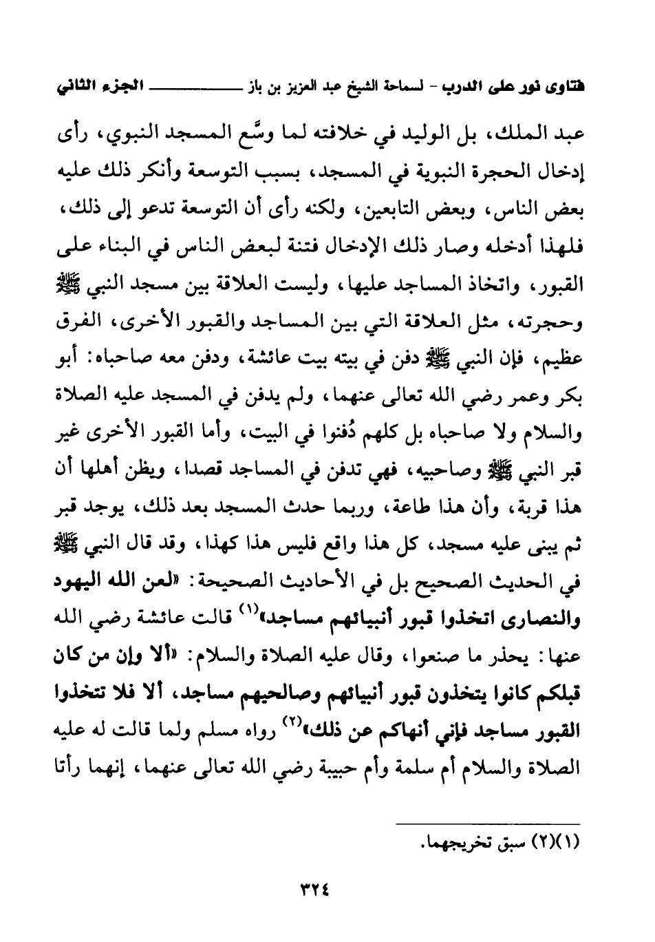 عبد الملك، بل الوليد في خلافته لما وسع المسجد النبوي، رأى إدخال الحجرة النبوية في المسجد، بسبب التوسعة وأنكر ذلك عليه بعض الناس، وبعض التابعين، ولكنه رأى أن التوسعة تدعو إلى ذلك، فلهذا أدخله وصار ذلك الإدخال فتنة لبعض الناس في البناء على القبور، واتخاذ المساجد عليها، وليست العلاقة بين مسجد النبي صلى الله عليه وسلم وحجرته، مثل العلاقة التي بين المساجد والقبور الأخرى، الفرق عظيم، فإن النبي صلى الله عليه وسلم دفن في بيته بيت عائشة، ودفن معه صاحباه: أبو بكر وعمر رضي الله عنهما، ولم يدفن في المسجد عليه الصلاة والسلام ولا صاحباه بل كلهم دفنوا في البيت، وأما القبور الأخرى غير قبر النبي صلى الله عليه وسلم وصاحبيه فهي تدفن في المساجد قصدا، ويظن أهلها أن هذا قربة، وأن هذا طاعة، وربما حدث المسجد بعد ذلك، يوجد قبر ثم يبنى عليه مسجد، كل هذا واقع فليس هذا كهذا، وقد قال النبي صلى الله عليه وسلم في الحديث الصحيح بل في الأحاديث الصحيحة: «لعن الله اليهود والنصارى اتخذوا قبور أنبيائهم مساجد (¬1)» قالت عائشة رضي الله عنها: يحذر ما صنعوا. وقال عليه الصلاة والسلام: «ألا وإن من كان قبلكم كانوا يتخذون قبور أنبيائهم وصالحيهم مساجد، ألا فلا تتخذوا القبور مساجد فإني أنهاكم عن ذلك (¬2)» رواه مسلم. ولما قالت له عليه الصلاة والسلام أم سلمة وأم حبيبة رضي الله تعالى عنهما: إنهما رأتا