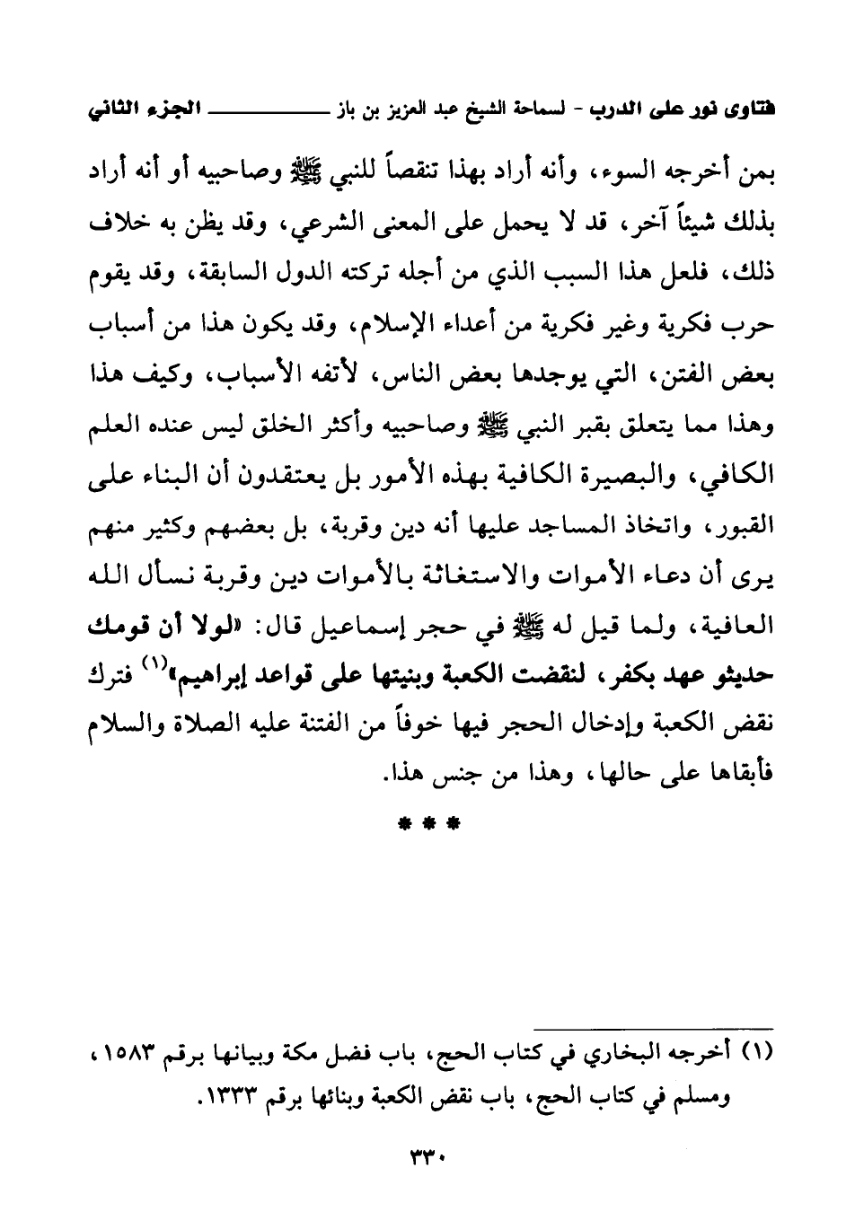 بمن أخرجه السوء، وأنه أراد بهذا تنقصا للنبي - صلى الله عليه وسلم - وصاحبيه أو أنه أراد بذلك شيئا آخر، قد لا يحمل على المعنى الشرعي، وقد يظن به خلاف ذلك، فلعل هذا السبب الذي من أجله تركته الدول السابقة، وقد يقوم حرب فكرية وغير فكرية من أعداء الإسلام، وقد يكون هذا من أسباب بعض الفتن، التي يوجدها بعض الناس، لأتفه الأسباب، وكيف هذا وهذا مما يتعلق بقبر النبي - صلى الله عليه وسلم - وصاحبيه وأكثر الخلق ليس عنده العلم الكافي، والبصيرة الكافية بهذه الأمور بل يعتقدون أن البناء على القبور، واتخاذ المساجد عليها أنه دين وقربة، بل بعضهم وكثير منهم يرى أن دعاء الأموات والاستغاثة بالأموات دين وقربة نسأل الله العافية، ولما قيل له - صلى الله عليه وسلم - في حجر إسماعيل قال: «لولا أن قومك حديثو عهد بكفر، لنقضت الكعبة وبنيتها على قواعد إبراهيم (¬1)» فترك نقض الكعبة وإدخال الحجر فيها خوفا من الفتنة عليه الصلاة والسلام فأبقاها على حالها، وهذا من جنس هذا.