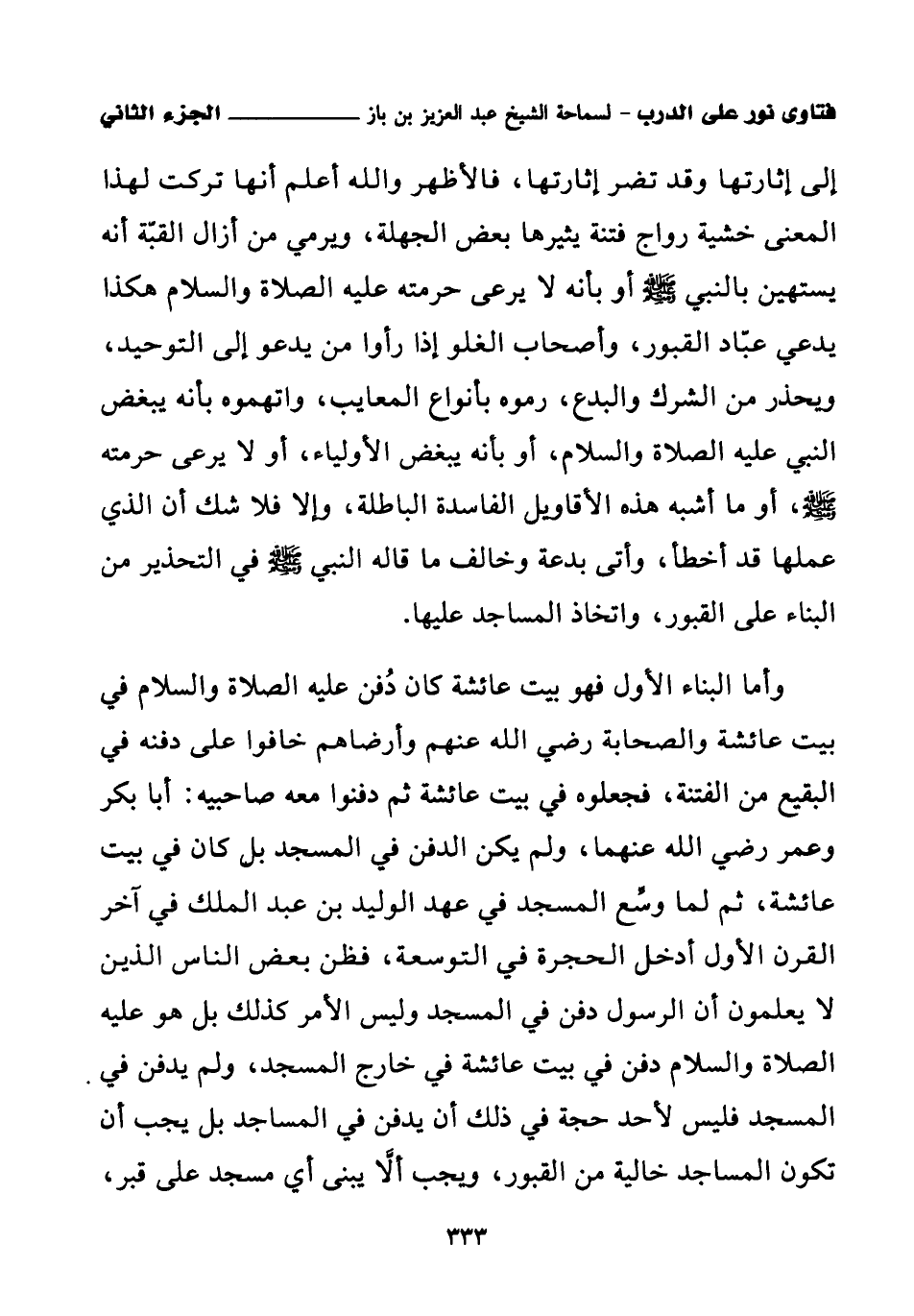 إلى إثارتها وقد تضر إثارتها، فالأظهر والله أعلم أنها تركت لهذا المعنى خشية رواج فتنة يثيرها بعض الجهلة، ويرمي من أزال القبة أنه يستهين بالنبي - صلى الله عليه وسلم - أو بأنه لا يرعى حرمته عليه الصلاة والسلام هكذا يدعي عباد القبور، وأصحاب الغلو إذا رأوا من يدعو إلى التوحيد، ويحذر من الشرك والبدع، رموه بأنواع المعايب، واتهموه بأنه يبغض النبي عليه الصلاة والسلام، أو بأنه يبغض الأولياء، أو لا يرعى حرمته - صلى الله عليه وسلم -، أو ما أشبه هذه الأقاويل الفاسدة الباطلة، وإلا فلا شك أن الذي عملها قد أخطأ، وأتى بدعة وخالف ما قاله النبي - صلى الله عليه وسلم - في التحذير من البناء على القبور، واتخاذ المساجد عليها.