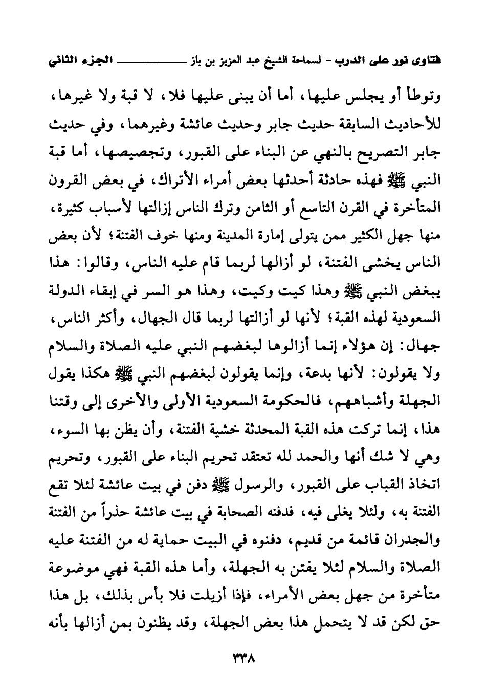 وتوطأ أو يجلس عليها، أما أن يبنى عليها فلا، لا قبة ولا غيرها، للأحاديث السابقة حديث جابر وحديث عائشة وغيرهما، وفي حديث جابر التصريح بالنهي عن البناء على القبور، وتجصيصها، أما قبة النبي - صلى الله عليه وسلم - فهذه حادثة أحدثها بعض أمراء الأتراك، في بعض القرون المتأخرة في القرن التاسع أو الثامن وترك الناس إزالتها لأسباب كثيرة، منها جهل الكثير ممن يتولى إمارة المدينة ومنها خوف الفتنة؛ لأن بعض الناس يخشى الفتنة، لو أزالها لربما قام عليه الناس، وقالوا: هذا يبغض النبي - صلى الله عليه وسلم - وهذا كيت وكيت، وهذا هو السر في إبقاء الدولة السعودية لهذه القبة؛ لأنها لو أزالتها لربما قال الجهال، وأكثر الناس جهال: إن هؤلاء إنما أزالوها لبغضهم النبي عليه الصلاة والسلام ولا يقولون: لأنها بدعة، وإنما يقولون لبغضهم النبي - صلى الله عليه وسلم - هكذا يقول الجهلة وأشباههم، فالحكومة السعودية الأولى والأخرى إلى وقتنا هذا، إنما تركت هذه القبة المحدثة خشية الفتنة، وأن يظن بها السوء، وهي لا شك أنها والحمد لله تعتقد تحريم البناء على القبور، وتحريم اتخاذ القباب على القبور، والرسول - صلى الله عليه وسلم - دفن في بيت عائشة لئلا تقع الفتنة به، ولئلا يغلى فيه، فدفنه الصحابة في بيت عائشة حذرا من الفتنة والجدران قائمة من قديم، دفنوه في البيت حماية له من الفتنة عليه الصلاة والسلام لئلا يفتن به الجهلة، وأما هذه القبة فهي موضوعة متأخرة من جهل بعض الأمراء، فإذا أزيلت فلا بأس بذلك، بل هذا حق لكن قد لا يتحمل هذا بعض الجهلة، وقد يظنون بمن أزالها بأنه