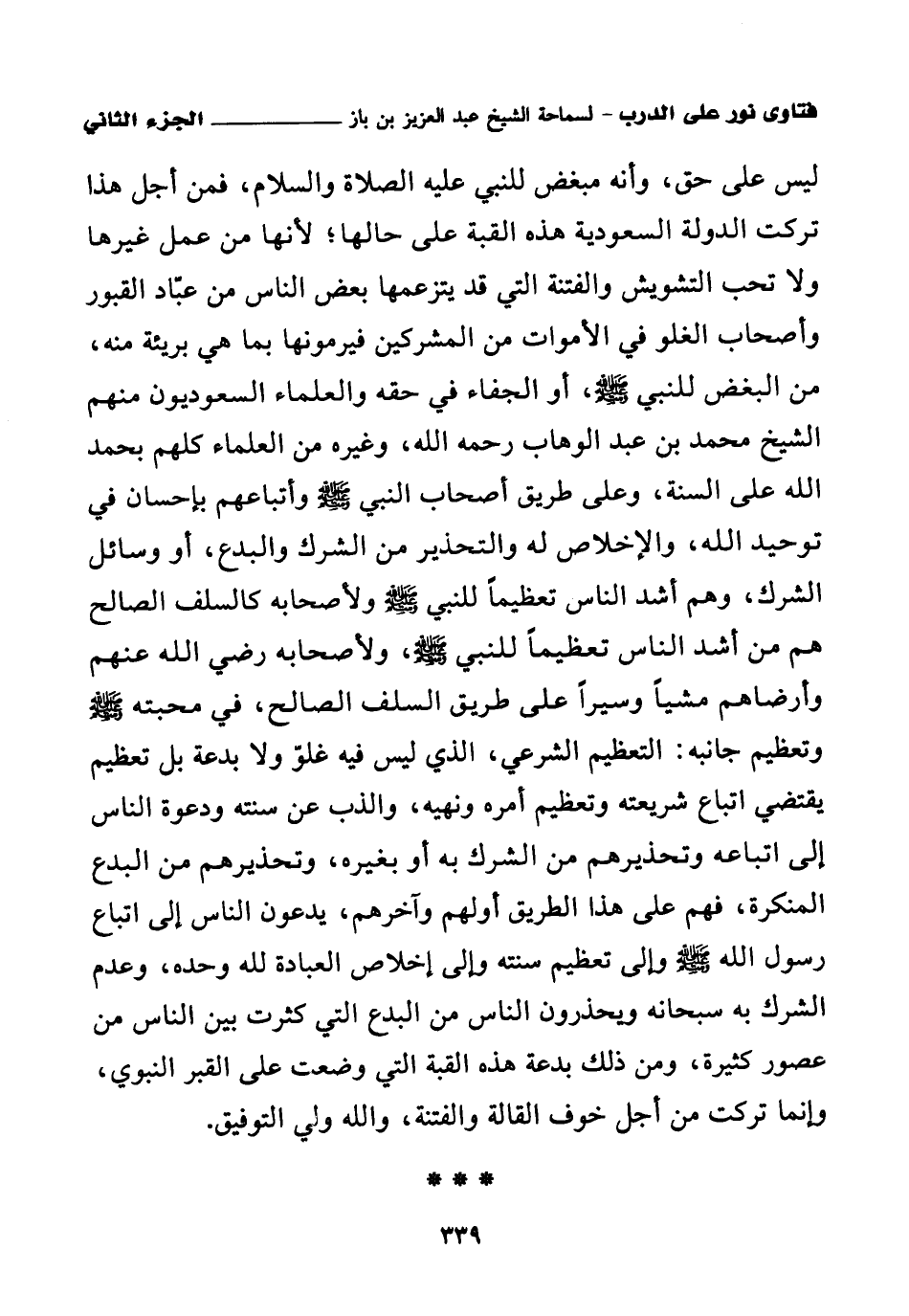 ليس على حق، وأنه مبغض للنبي عليه الصلاة والسلام، فمن أجل هذا تركت الدولة السعودية هذه القبة على حالها؛ لأنها من عمل غيرها ولا تحب التشويش والفتنة التي قد يتزعمها بعض الناس من عباد القبور وأصحاب الغلو في الأموات من المشركين فيرمونها بما هي بريئة منه، من البغض للنبي - صلى الله عليه وسلم -، أو الجفاء في حقه والعلماء السعوديون منهم الشيخ محمد بن عبد الوهاب رحمه الله، وغيره من العلماء كلهم بحمد الله على السنة، وعلى طريق أصحاب النبي - صلى الله عليه وسلم - وأتباعهم بإحسان في توحيد الله، والإخلاص له والتحذير من الشرك والبدع، أو وسائل الشرك، وهم أشد الناس تعظيما للنبي - صلى الله عليه وسلم - ولأصحابه كالسلف الصالح هم من أشد الناس تعظيما للنبي - صلى الله عليه وسلم -، ولأصحابه رضي الله عنهم وأرضاهم مشيا وسيرا على الطريق السلف الصالح، في محبته - صلى الله عليه وسلم - وتعظيم جانبه: التعظيم الشرعي، الذي ليس فيه غلو ولا بدعة بل تعظيم يقتضي اتباع شريعته وتعظيم أمره ونهيه، والذب عن سنته ودعوة الناس إلى اتباعه وتحذيرهم من الشرك به أو بغيره، وتحذيرهم من البدع المنكرة، فهم على هذا الطريق أولهم وآخرهم، يدعون الناس إلى اتباع رسول الله - صلى الله عليه وسلم - وإلى تعظيم سنته وإلى إخلاص العبادة لله وحده، وعدم الشرك به سبحانه ويحذرون الناس من البدع التي كثرت بين الناس من عصور كثيرة، ومن ذلك بدعة هذه القبة التي وضعت على القبر النبوي، وإنما تركت من أجل خوف القالة والفتنة، والله ولي التوفيق.
