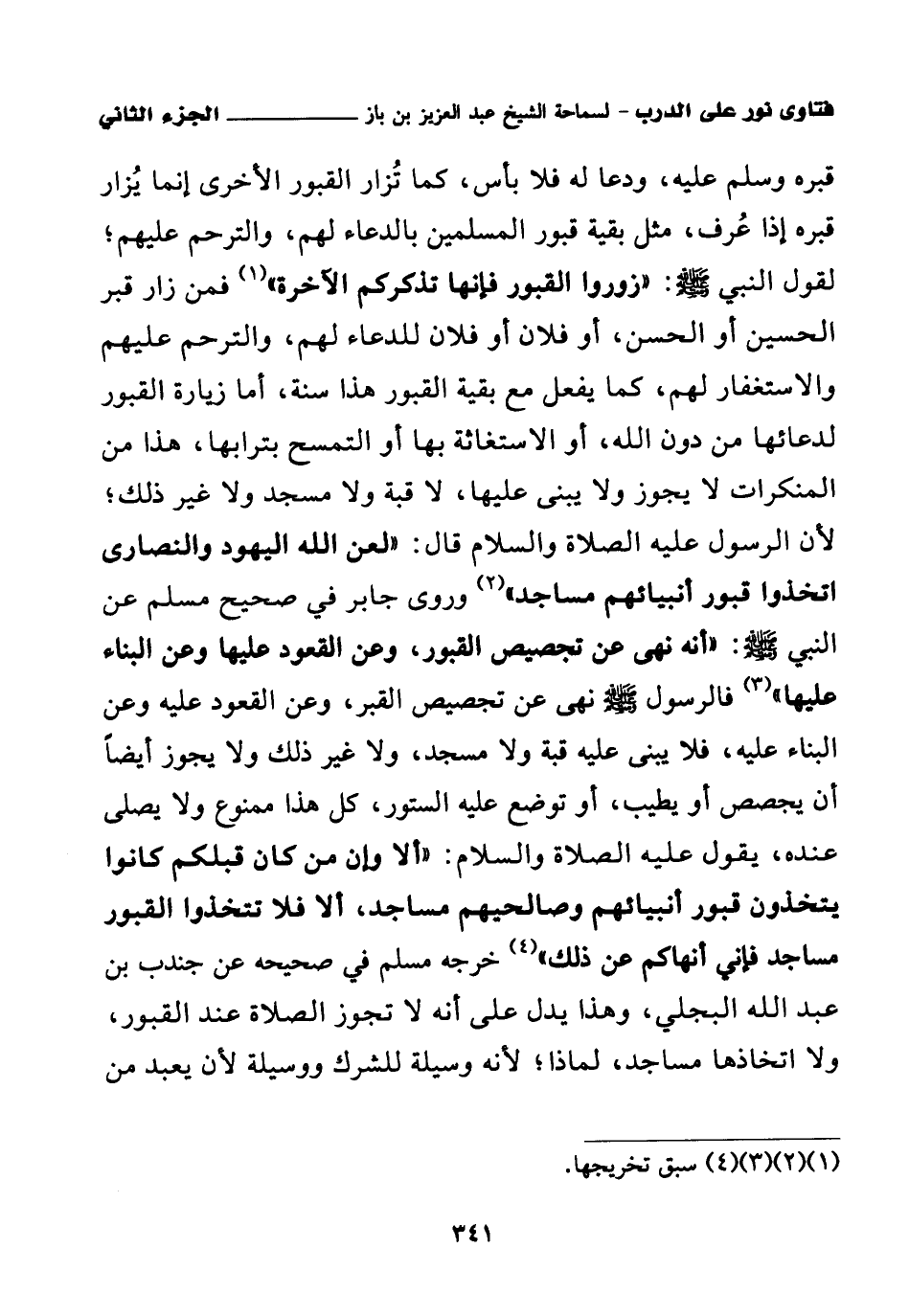قبره وسلم عليه، ودعا له فلا بأس، كما تزار القبور الأخرى إنما يزار قبره إذا عرف، مثل بقية قبور المسلمين بالدعاء لهم، والترحم عليهم؛ لقول النبي - صلى الله عليه وسلم -: «زوروا القبور فإنها تذكركم الآخرة (¬1)» فمن زار قبر الحسين أو الحسن، أو فلان أو فلان للدعاء لهم، والترحم عليهم والاستغفار لهم، كما يفعل مع بقية القبور هذا سنة، أما زيارة القبور لدعائها من دون الله، أو الاستغاثة بها أو التمسح بترابها، هذا من المنكرات لا يجوز ولا يبنى عليها، لا قبة ولا مسجد ولا غير ذلك؛ لأن الرسول عليه الصلاة والسلام قال: «لعن الله اليهود والنصارى اتخذوا قبور أنبيائهم مساجد (¬2)» وروى جابر في صحيح مسلم عن النبي - صلى الله عليه وسلم -: «أنه نهى عن تجصيص القبور، وعن القعود عليها وعن البناء عليها (¬3)» فالرسول - صلى الله عليه وسلم - نهى عن تجصيص القبر، وعن القعود عليه وعن البناء عليه، فلا يبنى عليه قبة ولا مسجد، ولا غير ذلك ولا يجوز أيضا أن يجصص أو يطيب، أو توضع عليه الستور، كل هذا ممنوع ولا يصلى عنده، يقول عليه الصلاة والسلام: «ألا وإن من كان قبلكم كانوا يتخذون قبور أنبيائهم وصالحيهم مساجد، ألا فلا تتخذوا القبور مساجد فإني أنهاكم عن ذلك (¬4)» خرجه مسلم في صحيحه عن جندب بن عبد الله البجلي، وهذا يدل على أنه لا تجوز الصلاة عند القبور، ولا اتخاذها مساجد، لماذا؟ لأنه وسيلة للشرك ووسيلة لأن يعبد من