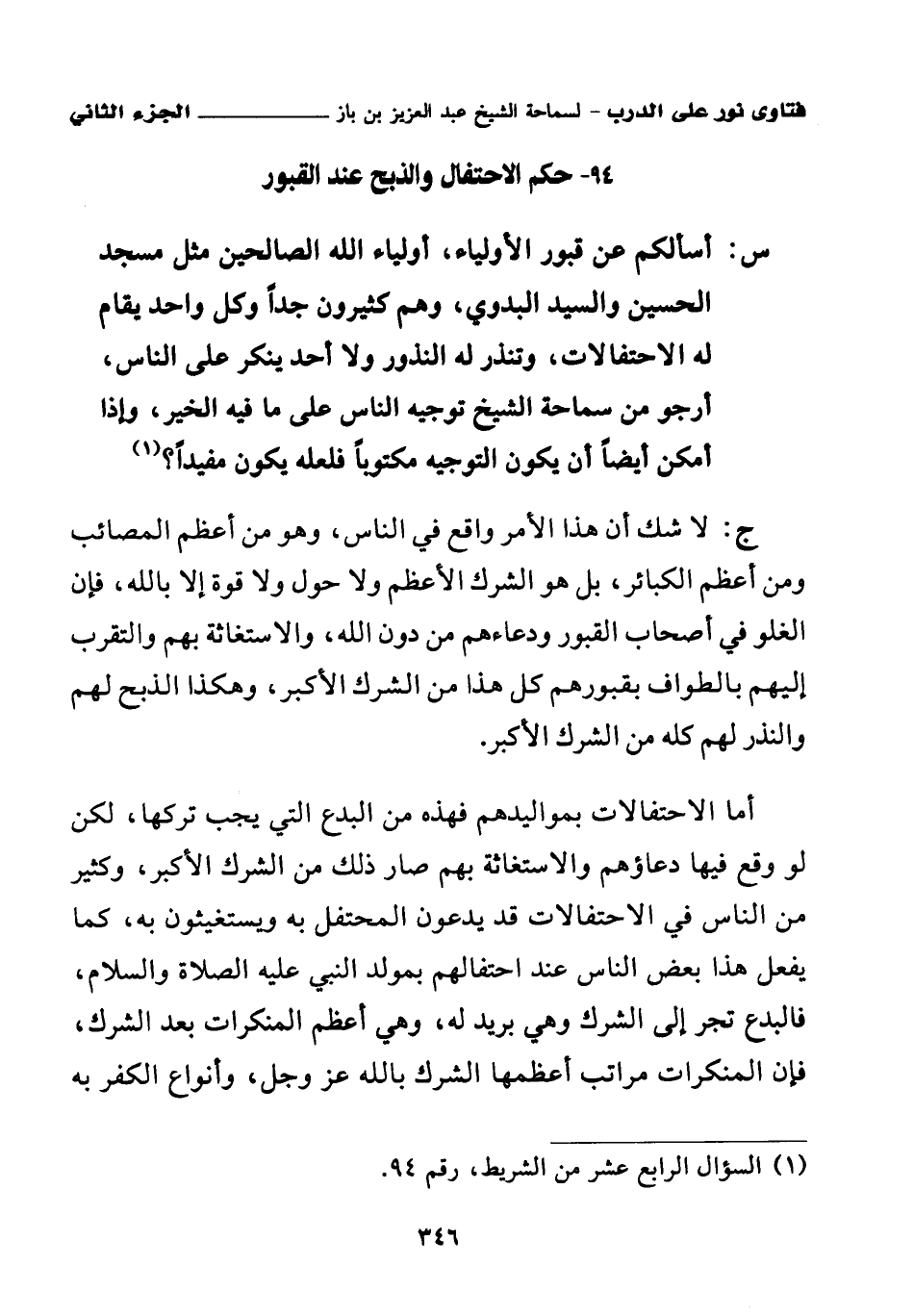 س: أسألكم عن قبور الأولياء، أولياء الله الصالحين مثل مسجد الحسين والسيد البدوي، وهم كثيرون جدا وكل واحد يقام له الاحتفالات، وتنذر له النذور ولا أحد ينكر على الناس، أرجو من سماحة الشيخ توجيه الناس على ما فيه الخير، وإذا أمكن أيضا أن يكون التوجيه مكتوبا فلعله يكون مفيدا؟ (¬1)
