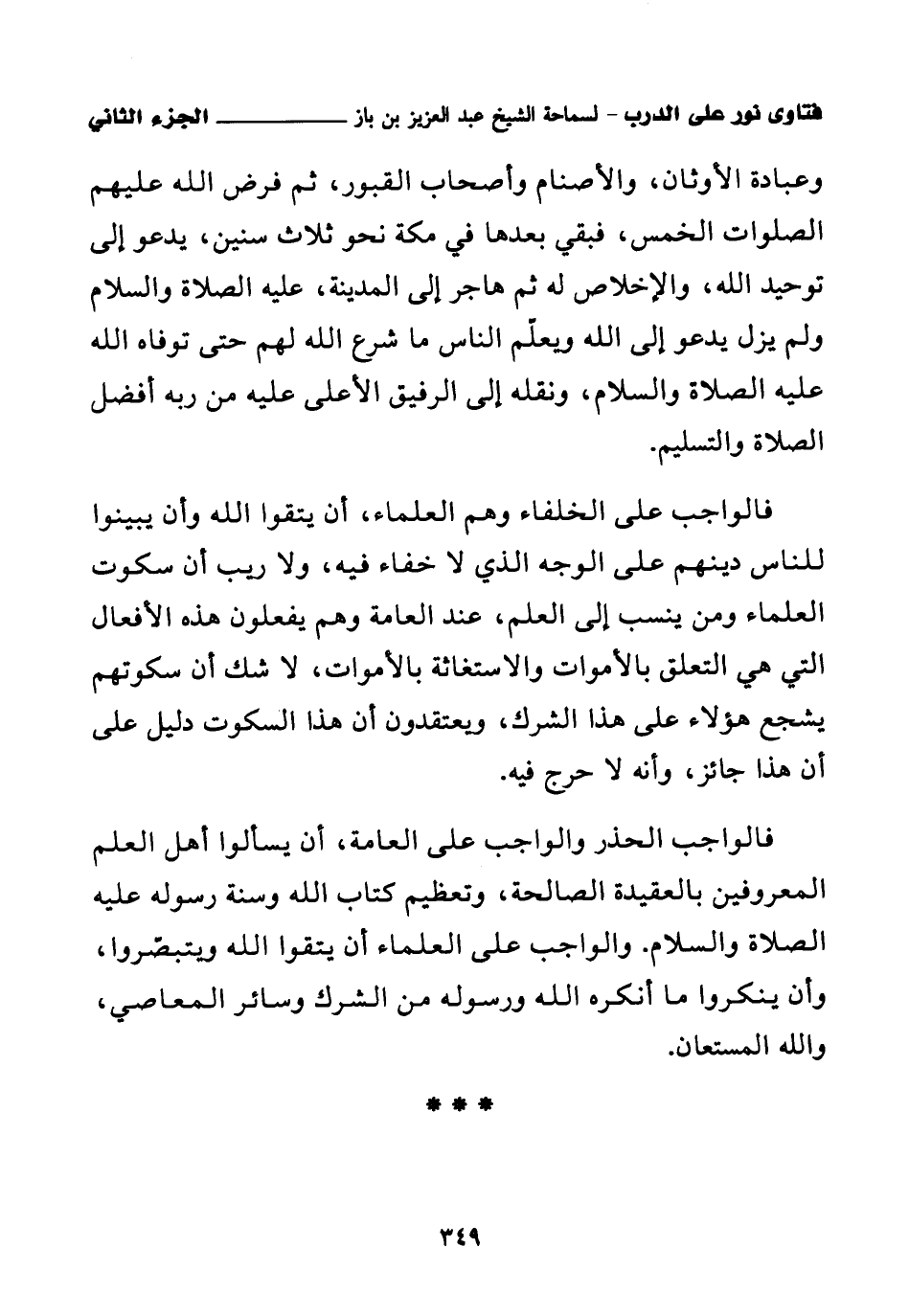 فالواجب على الخلفاء وهم العلماء، أن يتقوا الله وأن يبينوا للناس دينهم على الوجه الذي لا خفاء فيه، ولا ريب أن سكوت العلماء ومن ينسب إلى العلم، عند العامة وهم يفعلون هذه الأفعال التي هي التعلق بالأموات والاستغاثة بالأموات، لا شك أن سكوتهم يشجع هؤلاء على هذا الشرك، ويعتقدون أن هذا السكوت دليل على أن هذا جائز، وأنه لا حرج فيه.