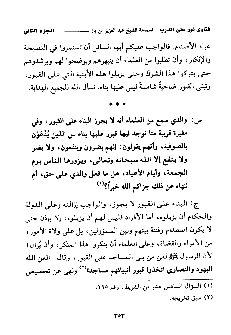 عباد الأصنام. فالواجب عليكم أيها السائل أن تستمروا في النصيحة والإنكار، وأن تطلبوا من العلماء أن ينبهوهم ويوضحوا لهم ويرشدوهم حتى يتركوا هذا الشرك وحتى يزيلوا هذه الأبنية التي على القبور، وتبقى القبور ضاحية شامسة ليس عليها بناء. نسأل الله للجميع الهداية.