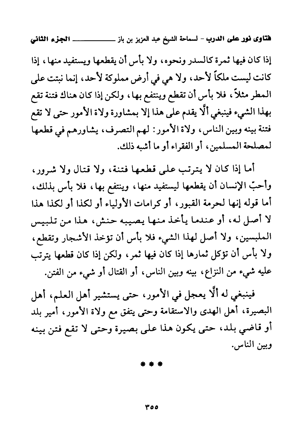 أما إذا كان لا يترتب على قطعها فتنة، ولا قتال ولا شرور، وأحب الإنسان أن يقطعها ليستفيد منها، وينتفع بها، فلا بأس بذلك، أما قوله إنها لحرمة القبور، أو كرامات الأولياء أو لكذا أو لكذا هذا لا أصل له، أو عندما يأخذ منها يصيبه حنش، هذا من تلبيس الملبسين، ولا أصل لهذا الشيء فلا بأس أن تؤخذ الأشجار وتقطع، ولا بأس أن تؤكل ثمارها إذا كان فيها ثمر، ولكن إذا كان قطعها يترتب عليه شيء من النزاع بينه وبين الناس، أو القتال أو شيء من الفتن.