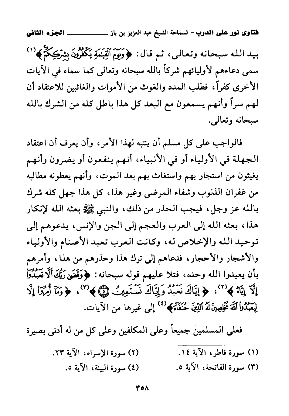 فالواجب على كل مسلم أن ينتبه لهذا الأمر، وأن يعرف أن اعتقاد الجهلة في الأولياء أو في الأنبياء، أنهم ينفعون أو يضرون وأنهم يغيثون من استجار بهم واستغاث بهم بعد الموت، وأنهم يعطونه مطالبه من غفران الذنوب وشفاء المرضى وغير هذا، كل هذا جهل كله شرك بالله عز وجل، فيجب الحذر من ذلك، والنبي - صلى الله عليه وسلم - بعثه الله لإنكار هذا، بعثه الله إلى العرب والعجم إلى الجن والإنس، يدعوهم إلى توحيد الله والإخلاص له، وكانت العرب تعبد الأصنام والأولياء والأشجار والأحجار، فدعاهم إلى ترك هذا وحذرهم من هذا، وأمرهم بأن يعبدوا الله وحده، فتلا عليهم قوله سبحانه: {وَقَضَى رَبُّكَ أَلَّا تَعْبُدُوا إِلَّا إِيَّاهُ} (¬2)، {إِيَّاكَ نَعْبُدُ وَإِيَّاكَ نَسْتَعِينُ} (¬3)، {وَمَا أُمِرُوا إِلَّا لِيَعْبُدُوا اللَّهَ مُخْلِصِينَ لَهُ الدِّينَ حُنَفَاءَ} (¬4) إلى غيرها من الآيات.