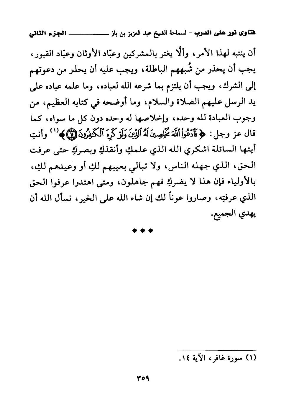 أن ينتبه لهذا الأمر، وألا يغتر بالمشركين وعباد الأوثان وعباد القبور، يجب أن يحذر من شبههم الباطلة، ويجب عليه أن يحذر من دعوتهم إلى الشرك، ويجب أن يلتزم بما شرعه الله لعباده، وما علمه عباده على يد الرسل عليهم الصلاة والسلام، وما أوضحه في كتابه العظيم، من وجوب العبادة لله وحده، وإخلاصها له وحده دون كل ما سواه، كما قال عز وجل: {فَادْعُوا اللَّهَ مُخْلِصِينَ لَهُ الدِّينَ وَلَوْ كَرِهَ الْكَافِرُونَ} (¬1) وأنت أيتها السائلة اشكري الله الذي علمك وأنقذك وبصرك حتى عرفت الحق، الذي جهله الناس، ولا تبالي بعيبهم لك أو وعيدهم لك، بالأولياء فإن هذا لا يضرك فهم جاهلون، ومتى اهتدوا عرفوا الحق الذي عرفته، وصاروا عونا لك إن شاء الله على الخير، نسأل الله أن يهدي الجميع.