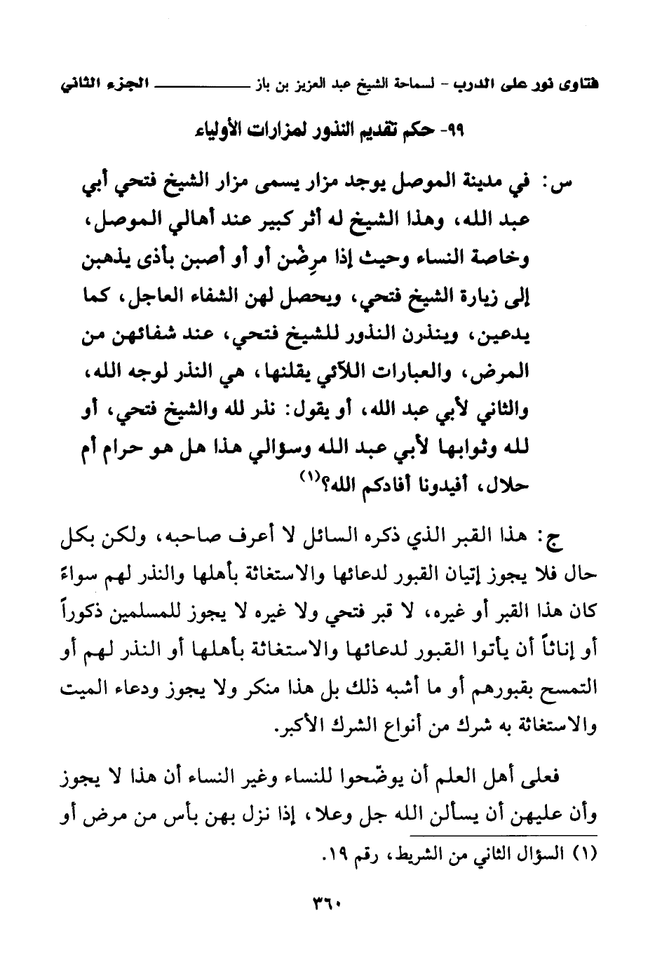 س: في مدينة الموصل يوجد مزار يسمى مزار الشيخ فتحي أبي عبد الله، وهذا الشيخ له أثر كبير عند أهالي الموصل، وخاصة النساء وحيث إذا مرضن أو أصبن بأذى يذهبن إلى زيارة الشيخ فتحي، ويحصل لهن الشفاء العاجل، كما يدعين، وينذرن النذور للشيخ فتحي، عند شفائهن من المرض، والعبارات اللآئي يقلنها، هي النذر لوجه الله، والثاني لأبي عبد الله، أو يقول: نذر لله والشيخ فتحي، أو لله وثوابها لأبي عبد الله؛ وسؤالي هذا هل هو حرام أم حلال، أفيدونا أفادكم الله؟ (¬1)