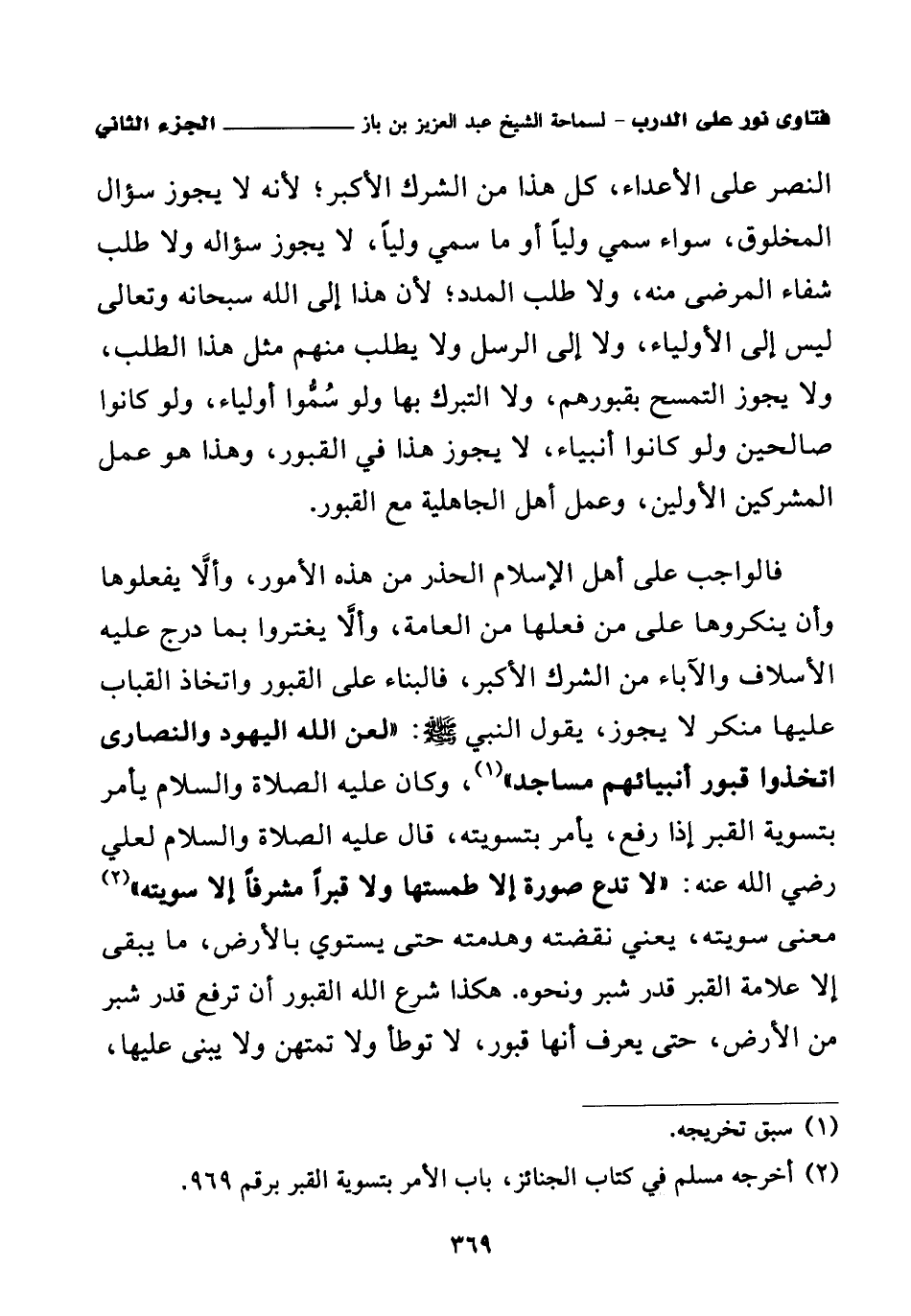 فالواجب على أهل الإسلام الحذر من هذه الأمور، وألا يفعلوها وأن ينكروها على من فعلها من العامة، وألا يغتروا بما درج عليه الأسلاف والآباء من الشرك الأكبر، فالبناء على القبور واتخاذ القباب عليها منكر لا يجوز، يقول النبي - صلى الله عليه وسلم -: «لعن الله اليهود والنصارى اتخذوا قبور أنبيائهم مساجد (¬1)»، وكان عليه الصلاة والسلام يأمر بتسوية القبر إذا رفع، يأمر بتسويته، قال عليه الصلاة والسلام لعلي رضي الله عنه: «لا تدع صورة إلا طمستها ولا قبرا مشرفا إلا سويته (¬2)». معنى سويته، يعني نقضته وهدمته حتى يستوي بالأرض، ما يبقى إلا علامة القبر قدر شبر ونحوه. هكذا شرع الله القبور أن ترفع قدر شبر من الأرض، حتى يعرف أنها قبور، لا توطأ ولا تمتهن ولا يبنى عليها،