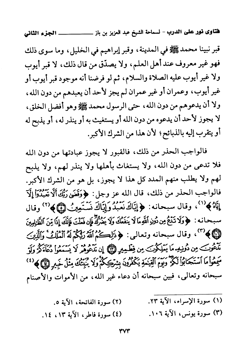 فالواجب الحذر من ذلك، فالقبور لا يجوز عبادتها من دون الله فلا تدعى من دون الله، ولا يستغاث بأهلها ولا ينذر لهم، ولا يذبح لهم ولا يطلب منهم المدد كل هذا لا يجوز، بل هو من الشرك الأكبر؛ فالواجب الحذر من ذلك، قال الله عز وجل: {وَقَضَى رَبُّكَ أَلَّا تَعْبُدُوا إِلَّا إِيَّاهُ} (¬1)، وقال سبحانه: {إِيَّاكَ نَعْبُدُ وَإِيَّاكَ نَسْتَعِينُ} (¬2)، وقال سبحانه: {وَلَا تَدْعُ مِنْ دُونِ اللَّهِ مَا لَا يَنْفَعُكَ وَلَا يَضُرُّكَ فَإِنْ فَعَلْتَ فَإِنَّكَ إِذًا مِنَ الظَّالِمِينَ} (¬3) وقال سبحانه وتعالى: {ذَلِكُمُ اللَّهُ رَبُّكُمْ لَهُ الْمُلْكُ وَالَّذِينَ تَدْعُونَ مِنْ دُونِهِ مَا يَمْلِكُونَ مِنْ قِطْمِيرٍ} (¬4) {إِنْ تَدْعُوهُمْ لَا يَسْمَعُوا دُعَاءَكُمْ وَلَوْ سَمِعُوا مَا اسْتَجَابُوا لَكُمْ وَيَوْمَ الْقِيَامَةِ يَكْفُرُونَ بِشِرْكِكُمْ وَلَا يُنَبِّئُكَ مِثْلُ خَبِيرٍ} (¬5) سبحانه وتعالى، فبين سبحانه أن دعاء غير الله، من الأموات والأصنام