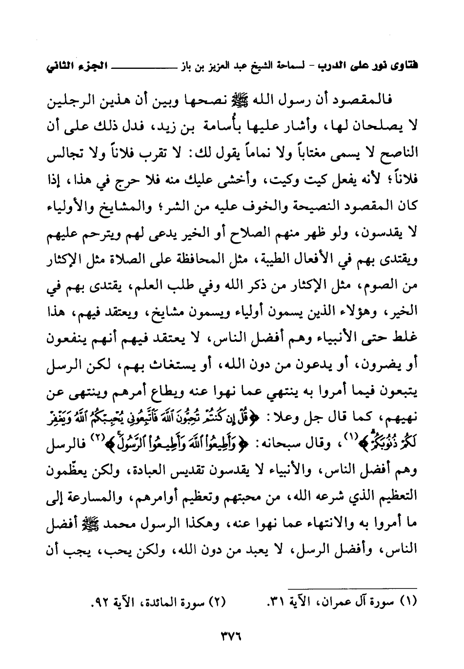 فالمقصود أن رسول الله - صلى الله عليه وسلم - نصحها وبين أن هذين الرجلين لا يصلحان لها، وأشار عليها بأسامة بن زيد، فدل ذلك على أن الناصح لا يسمى مغتابا ولا نماما يقول لك: لا تقرب فلانا ولا تجالس فلانا؛ لأنه يفعل كيت وكيت، وأخشى عليك منه فلا حرج في هذا، وإذا كان المقصود النصيحة والخوف عليه من الشر؛ والمشايخ والأولياء لا يقدسون، ولو ظهر منهم الصلاح أو الخير يدعى لهم ويترحم عليهم ويقتدى بهم في الأفعال الطيبة، مثل المحافظة على الصلاة مثل الإكثار من الصوم، مثل الإكثار من ذكر الله وفي طلب العلم، يقتدى بهم في الخير، وهؤلاء الذين يسمون أولياء ويسمون مشايخ، ويعتقد فيهم، هذا غلط حتى الأنبياء وهم أفضل الناس، لا يعتقد فيهم أنهم ينفعون أو يضرون، أو يدعون من دون الله، أو يستغاث بهم، لكن الرسل يتبعون فيما أمروا به ينتهي عما نهوا عنه ويطاع أمرهم وينتهى عن نهيهم، كما قال جل وعلا: {قُلْ إِنْ كُنْتُمْ تُحِبُّونَ اللَّهَ فَاتَّبِعُونِي يُحْبِبْكُمُ اللَّهُ وَيَغْفِرْ لَكُمْ ذُنُوبَكُمْ} (¬1)، وقال سبحانه: {وَأَطِيعُوا اللَّهَ وَأَطِيعُوا الرَّسُولَ} (¬2)، فالرسل وهم أفضل الناس، والأنبياء لا يقدسون تقديس العبادة، ولكن يعظمون التعظيم الذي شرعه الله، من محبتهم وتعظيم أوامرهم، والمسارعة إلى ما أمروا به والانتهاء عما نهوا عنه، وهكذا الرسول محمد - صلى الله عليه وسلم - أفضل الناس، وأفضل الرسل، لا يعبد من دون الله، ولكن يحب، يجب أن