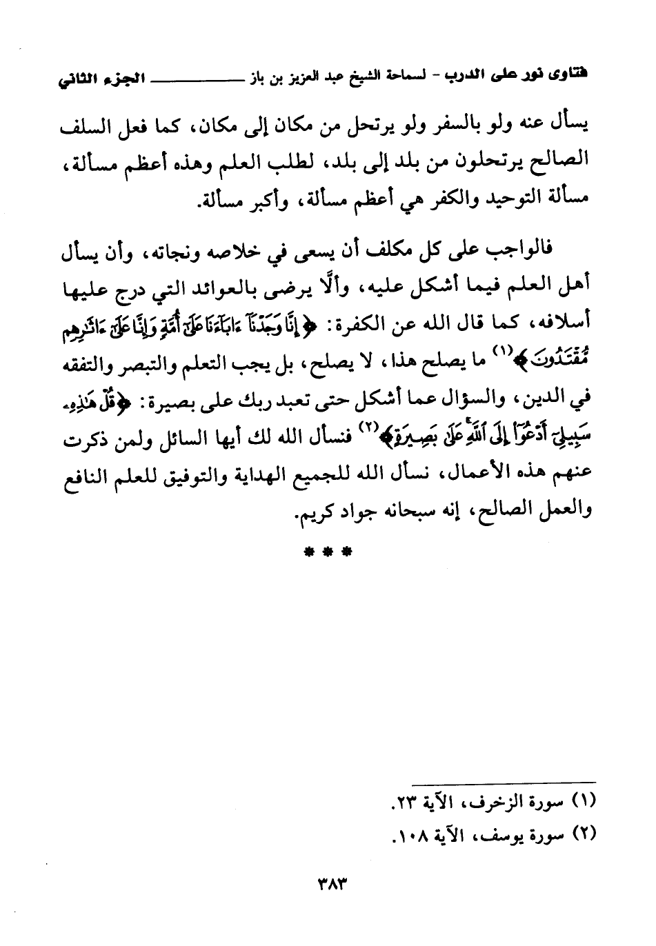 يسأل عنه ولو بالسفر ولو يرتحل من مكان إلى مكان كما فعل السلف الصالح يرتحلون من بلد إلى بلد، لطلب العلم وهذه أعظم مسألة، مسألة التوحيد والكفر هي أعظم مسألة، وأكبر مسألة.