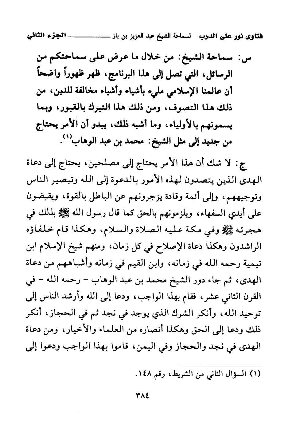 س: سماحة الشيخ: من خلال ما عرض على سماحتكم من الرسائل، التي تصل إلى هذا البرنامج، ظهر ظهورا واضحا أن عالمنا الإسلامي مليء بأشياء وأشياء مخالفة للدين، من ذلك هذا التصوف، ومن ذلك هذا التبرك بالقبور، وبما يسمونهم بالأولياء، وما أشبه ذلك، يبدو أن الأمر يحتاج من جديد إلى مثل الشيخ: محمد بن عبد الوهاب. (¬1)