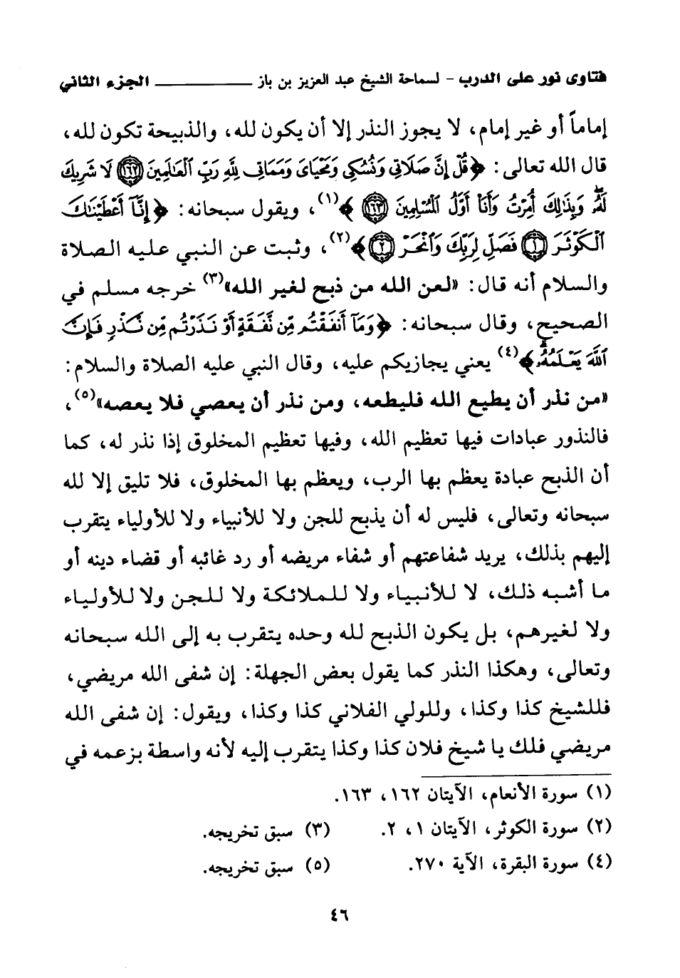 إماما أو غير إمام، لا يجوز النذر إلا أن يكون لله، والذبيحة تكون لله، قال الله تعالى: {قُلْ إِنَّ صَلَاتِي وَنُسُكِي وَمَحْيَايَ وَمَمَاتِي لِلَّهِ رَبِّ الْعَالَمِينَ} (¬1) {لَا شَرِيكَ لَهُ وَبِذَلِكَ أُمِرْتُ وَأَنَا أَوَّلُ الْمُسْلِمِينَ} (¬2)، ويقول سبحانه: {إِنَّا أَعْطَيْنَاكَ الْكَوْثَرَ} (¬3) {فَصَلِّ لِرَبِّكَ وَانْحَرْ} (¬4)، وثبت عن النبي - عليه الصلاة والسلام - أنه قال: «لعن الله من ذبح لغير الله (¬5)» خرجه مسلم في الصحيح، وقال سبحانه: {وَمَا أَنْفَقْتُمْ مِنْ نَفَقَةٍ أَوْ نَذَرْتُمْ مِنْ نَذْرٍ فَإِنَّ اللَّهَ يَعْلَمُهُ} (¬6) يعني يجازيكم عليه، وقال النبي - عليه الصلاة والسلام -: «من نذر أن يطيع الله فليطعه، ومن نذر أن يعصي الله فلا يعصه (¬7)»، فالنذور عبادات فيها تعظيم الله، وفيها تعظيم المخلوق إذا نذر له، كما أن الذبح عبادة يعظم بها الرب، ويعظم بها المخلوق، فلا تليق إلا لله سبحانه وتعالى، فليس له أن يذبح للجن ولا للأنبياء يتقرب إليهم بذلك، يريد شفاعتهم أو شفاء مريضه أو رد غائبه أو قضاء دينه أو ما أشبه ذلك، لا للأنبياء ولا للملائكة ولا للجن ولا للأولياء ولا لغيرهم، بل يكون الذبح لله وحده يتقرب به إلى الله سبحانه وتعالى، وهكذا النذر كما يقول بعض الجهلة: إن شفى الله مريضي، فللشيخ كذا وكذا، وللولي الفلاني كذا وكذا، ويقول: إن شفى الله مريضي فلك يا شيخ فلان كذا وكذا يتقرب إليه لأنه واسطة بزعمه في