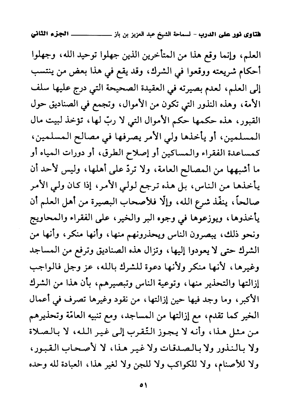 العلم، وإنما وقع هذا من المتأخرين الذين جهلوا توحيد الله، وجهلوا أحكام شريعته ووقعوا في الشرك، وقد يقع في هذا بعض من ينتسب إلى العلم، لعدم بصيرته في العقيدة الصحيحة التي درج عليها سلف الأمة، وهذه النذور التي تكون من الأموال، وتجمع في الصناديق حول القبور، هذه حكمها حكم الأموال التي لا رب لها، تؤخذ لبيت مال المسلمين، أو يأخذها ولي الأمر يصرفها في مصالح المسلمين، كمساعدة الفقراء والمساكين أو إصلاح الطرق، أو دورات المياه أو ما أشبهها من المصالح العامة، ولا ترد على أهلها، وليس لأحد أن يأخذها من الناس، بل هذه ترجع لولي الأمر، إذا كان ولي الأمر صالحا، ينفذ شرع الله، وإلا فلأصحاب البصيرة من أهل العلم أن يأخذوها، ويوزعوها في وجوه البر والخير، على الفقراء والمحاويج ونحو ذلك، يبصرون الناس ويحذرونهم منها، وأنها منكر، وأنها من الشرك حتى لا يعودوا إليها، وتزال هذه الصناديق وترفع من المساجد وغيرها، لأنها منكر ولأنها دعوة للشرك بالله، عز وجل فالواجب إزالتها والتحذير منها، وتوعية الناس وتبصيرهم، بأن هذا من الشرك الأكبر، وما وجد فيها حين إزالتها، من نقود وغيرها تصرف في أعمال الخير كما تقدم، مع إزالتها من المساجد، ومع تنبيه العامة وتحذيرهم من مثل هذا، وأنه لا يجوز التقرب إلى غير الله، لا بالصلاة ولا بالنذور ولا بالصدقات ولا غير هذا، لا لأصحاب القبور، ولا للأصنام، ولا للكواكب ولا للجن ولا لغير هذا، العبادة لله وحده