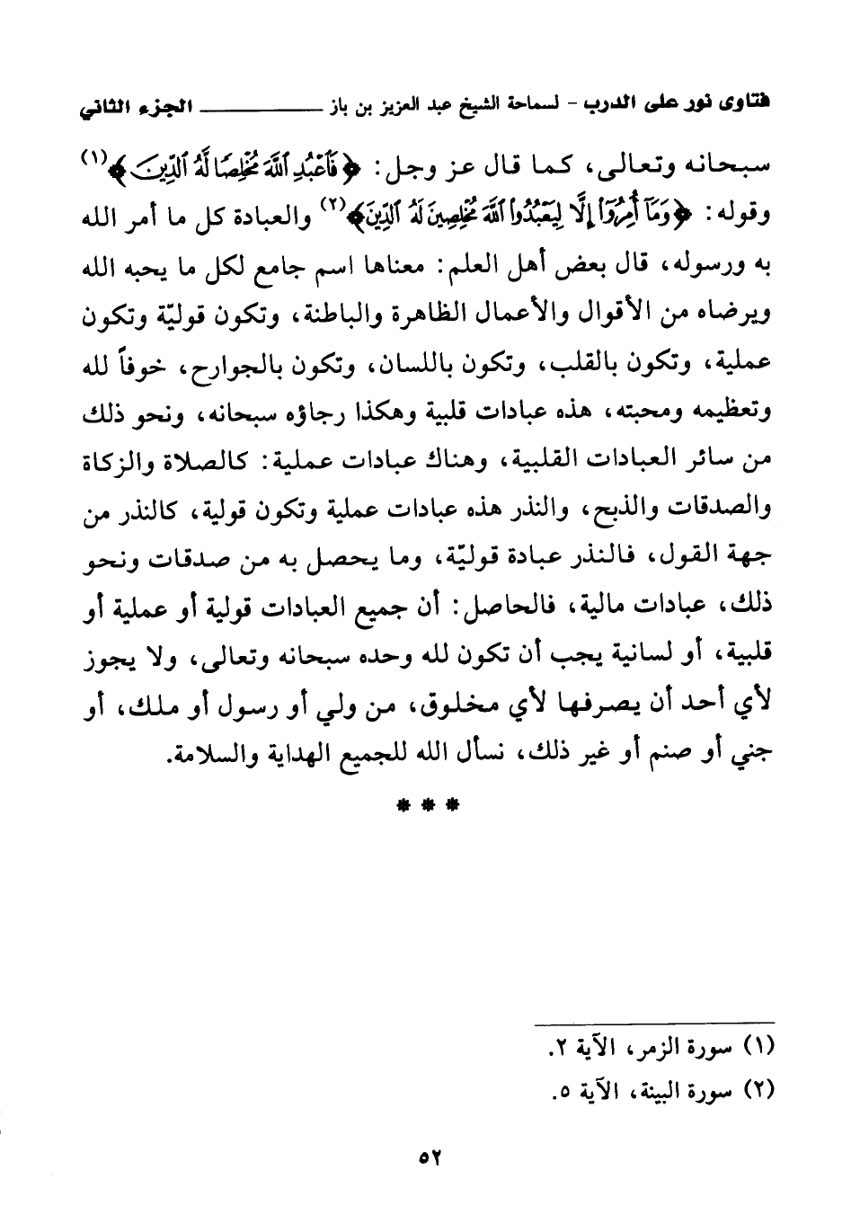 سبحانه وتعالى، كما قال عز وجل: {فَاعْبُدِ اللَّهَ مُخْلِصًا لَهُ الدِّينَ} (¬1)، وقوله: {وَمَا أُمِرُوا إِلَّا لِيَعْبُدُوا اللَّهَ مُخْلِصِينَ لَهُ الدِّينَ} (¬2) والعبادة كل ما أمر الله به ورسوله، قال بعض أهل العلم: معناها اسم جامع لكل ما يحبه الله ويرضاه من الأقوال والأعمال الظاهرة والباطنة، وتكون قولية وتكون عملية، وتكون بالقلب، وتكون باللسان، وتكون بالجوارح، خوفا لله وتعظيمه ومحبته، هذه عبادات قلبية وهكذا رجاؤه سبحانه، ونحو ذلك من سائر العبادات القلبية، وهناك عبادات عملية: كالصلاة والزكاة والصدقات والذبح، والنذر هذه عبادات عملية وتكون قولية، كالنذر من جهة القول، فالنذر عبادة قولية، وما يحصل به من صدقات ونحو ذلك، عبادات مالية، فالحاصل: أن جميع العبادات قولية أو عملية أو قلبية أو لسانية يجب أن تكون لله وحده سبحانه وتعالى، ولا يجوز لأي أحد أن يصرفها لأي مخلوق، من ولي أو رسول أو ملك، أو جني أو صنم أو غير ذلك، نسأل الله للجميع الهداية والسلامة.