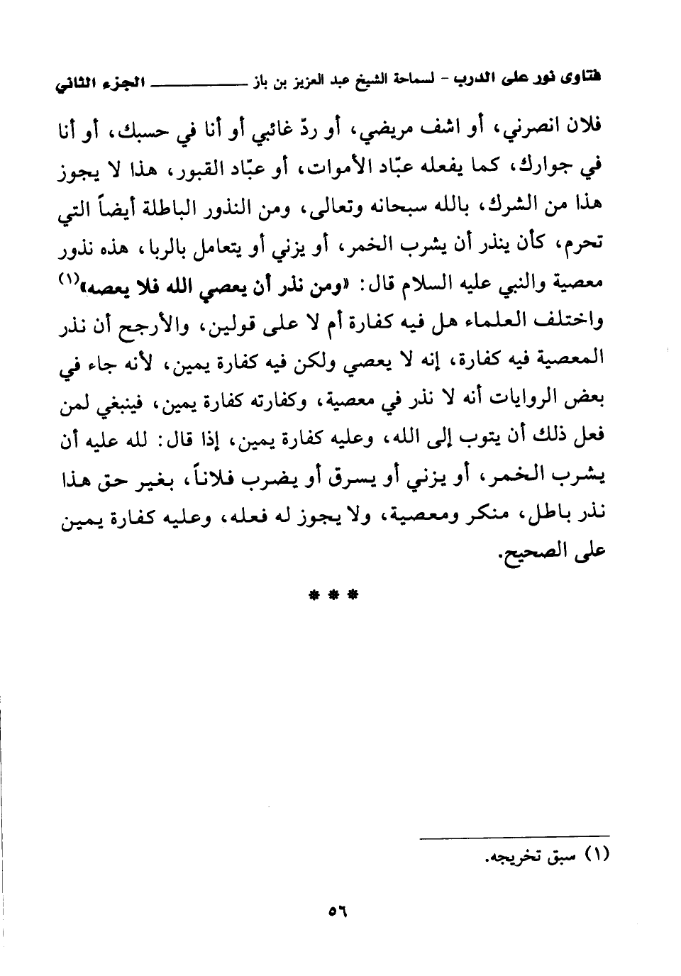 فلان انصرني، أو اشف مريضي، أو رد غائبي أو أنا في حسبك، أو أنا في جوارك، كما يفعله عباد الأموات، أو عباد القبور، هذا لا يجوز هذا من الشرك بالله سبحانه وتعالى، ومن النذور البطالة أيضا التي تحرم، كأن ينذر أن يشرب الخمر، أو يزني أو يتعامل بالربا، هذه نذور معصية والنبي عليه السلام قال: «ومن نذر أن يعصي الله فلا يعصه (¬1)». واختلف العلماء هل فيه كفارة أم لا على قولين، والأرجح أن نذر المعصية فيه كفارة، إنه لا يعصي ولكن فيه كفارة يمين، لأنه جاء في بعض الروايات أنه لا نذر في معصية، وكفارته كفارة يمين، فينبغي لمن فعل ذلك أن يتوب إلى الله، وعليه كفارة يمين، إذا قال: لله عليه أن يشرب الخمر، أو يزني أو يسرق أو يضرب فلانا بغير حق، هذا نذر باطل منكر ومعصية، ولا يجوز له فعله، وعليه كفارة يمين على الصحيح.