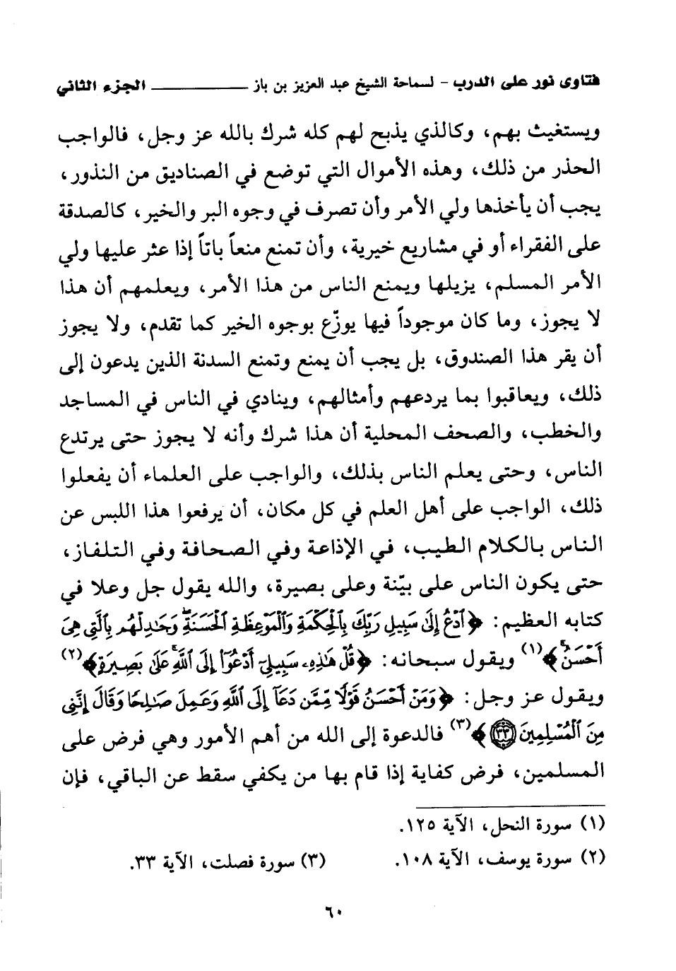 ويستغيث بهم، وكالذي يذبح لهم كله شرك بالله عز وجل، فالواجب الحذر من ذلك، وهذه الأموال التي توضع في الصناديق من النذور، يجب أن يأخذها ولي الأمر وأن تصرف في وجوه البر والخير، كالصدقة على الفقراء أو في مشاريع خيرية، وأن تمنع منعا باتا إذا عثر عليها ولي الأمر المسلم، يزيلها ويمنع الناس من هذا الأمر، ويعلمهم أن هذا لا يجوز، وما كان موجودا فيها يوزع بوجوه الخير كما تقدم، ولا يجوز أن يقر هذا الصندوق، بل يجب أن يمنع وتمنع السدنة الذين يدعون إلى ذلك، ويعاقبوا بما يردعهم وأمثالهم، وينادي في الناس في المساجد والخطب والصحف المحلية أن هذا شرك وأنه لا يجوز حتى يرتدع الناس، وحتى يعلم الناس بذلك، والواجب على العلماء أن يفعلوا ذلك، الواجب على أهل العلم في كل مكان أن يرفعوا هذا اللبس عن الناس بالكلام الطيب في الإذاعة وفي الصحافة وفي التلفاز، حتى يكون الناس على بينة وعلى بصيرة، والله يقول جل وعلا في كتابه العظيم: {ادْعُ إِلَى سَبِيلِ رَبِّكَ بِالْحِكْمَةِ وَالْمَوْعِظَةِ الْحَسَنَةِ وَجَادِلْهُمْ بِالَّتِي هِيَ أَحْسَنُ} (¬1)، ويقول سبحانه: {قُلْ هَذِهِ سَبِيلِي أَدْعُو إِلَى اللَّهِ عَلَى بَصِيرَةٍ} (¬2)، ويقول عز وجل: {وَمَنْ أَحْسَنُ قَوْلًا مِمَّنْ دَعَا إِلَى اللَّهِ وَعَمِلَ صَالِحًا وَقَالَ إِنَّنِي مِنَ الْمُسْلِمِينَ} (¬3)؛ فالدعوة إلى الله من أهم الأمور وهي فرض على المسلمين فرض كفاية إذا قام بها من يكفي سقط عن الباقي، فإن
