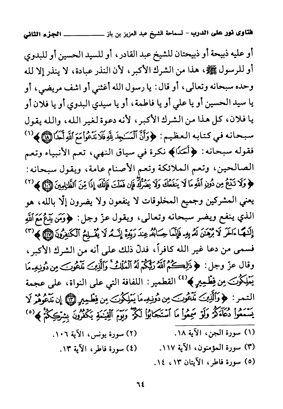 أو عليه ذبيحة أو ذبيحتان للشيخ عبد القادر، أو للسيد الحسين أو للبدوي أو للرسول - صلى الله عليه وسلم -، هذا من الشرك الأكبر، لأن النذر عبادة، لا ينذر إلا لله وحده سبحانه وتعالى، أو قال: يا رسول الله أغثني أو اشف مريضي، أو يا سيد الحسين أو يا علي أو يا فاطمة، أو يا سيدي البدوي أو يا فلان أو يا فلان، كل هذا من الشرك الأكبر، لأنه دعوة لغير الله، والله يقول سبحانه في كتابه العظيم: {وَأَنَّ الْمَسَاجِدَ لِلَّهِ فَلَا تَدْعُوا مَعَ اللَّهِ أَحَدًا} (¬1)، فقول سبحانه أحدا نكرة في سياق النهي، تعم الأنبياء وتعم الصالحين، وتعم الملائكة وتعم الأصنام عامة، ويقول سبحانه: {وَلَا تَدْعُ مِنْ دُونِ اللَّهِ مَا لَا يَنْفَعُكَ وَلَا يَضُرُّكَ فَإِنْ فَعَلْتَ فَإِنَّكَ إِذًا مِنَ الظَّالِمِينَ} (¬2). يعني المشركين وجميع المخلوقات لا ينفعون ولا يضرون إلا بالله، هو الذي ينفع ويضر سبحانه وتعالى، ويقول عز وجل: {وَمَنْ يَدْعُ مَعَ اللَّهِ إِلَهًا آخَرَ لَا بُرْهَانَ لَهُ بِهِ فَإِنَّمَا حِسَابُهُ عِنْدَ رَبِّهِ إِنَّهُ لَا يُفْلِحُ الْكَافِرُونَ} (¬3) فسمى من دعا غير الله كافرا، فدل ذلك على أنه من الشرك الأكبر، وقال عز وجل: {ذَلِكُمُ اللَّهُ رَبُّكُمْ لَهُ الْمُلْكُ وَالَّذِينَ تَدْعُونَ مِنْ دُونِهِ مَا يَمْلِكُونَ مِنْ قِطْمِيرٍ} (¬4)؛ القطمير: اللفافة التي على النواة، على عجمة التمر: {وَالَّذِينَ تَدْعُونَ مِنْ دُونِهِ مَا يَمْلِكُونَ مِنْ قِطْمِيرٍ} (¬5) {إِنْ تَدْعُوهُمْ لَا يَسْمَعُوا دُعَاءَكُمْ وَلَوْ سَمِعُوا مَا اسْتَجَابُوا لَكُمْ وَيَوْمَ الْقِيَامَةِ يَكْفُرُونَ بِشِرْكِكُمْ} (¬6)