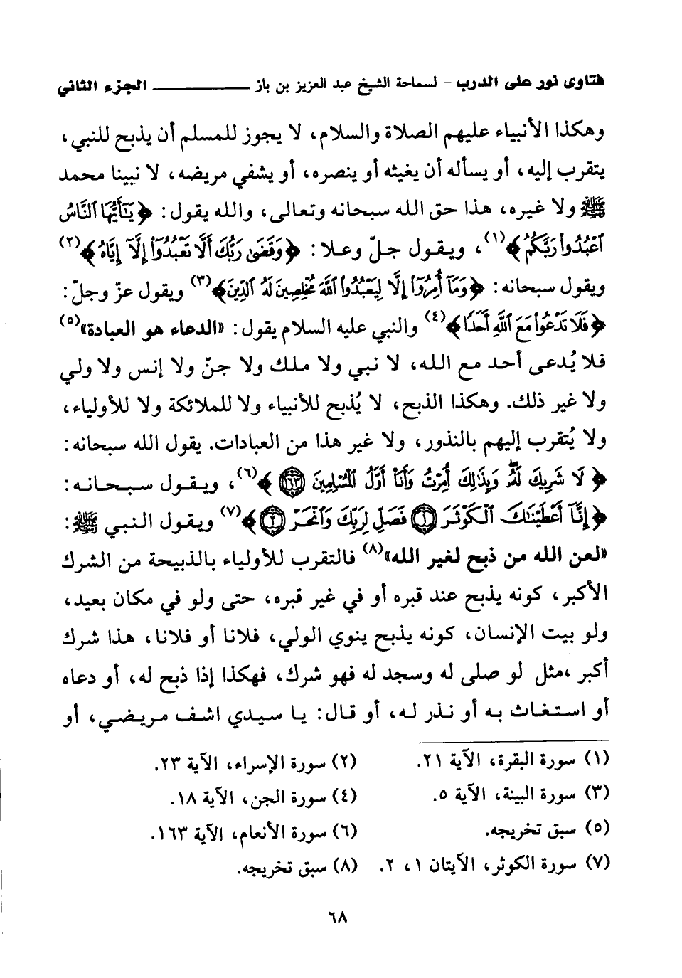 وهكذا الأنبياء عليهم الصلاة والسلام، لا يجوز للمسلم أن يذبح للنبي، يتقرب إليه، أو يسأله أن يغيثه أو ينصره، أو يشفي مريضه، لا نبينا محمد - صلى الله عليه وسلم - ولا غيره، هذا حق الله سبحانه وتعالى، والله يقول: {يَا أَيُّهَا النَّاسُ اعْبُدُوا رَبَّكُمُ} (¬1)، ويقول عز وجل: {وَقَضَى رَبُّكَ أَلَّا تَعْبُدُوا إِلَّا إِيَّاهُ} (¬2)، ويقول سبحانه: {وَمَا أُمِرُوا إِلَّا لِيَعْبُدُوا اللَّهَ مُخْلِصِينَ لَهُ الدِّينَ} (¬3)، ويقول عز وجل: {فَلَا تَدْعُوا مَعَ اللَّهِ أَحَدًا} (¬4) والنبي عليه السلام يقول: «الدعاء هو العبادة (¬5)» فلا يدعى أحد مع الله، لا نبي ولا ملك ولا جن ولا إنس ولا ولي ولا غير ذلك. وهكذا الذبح، لا يذبح للأنبياء ولا للملائكة ولا للأولياء، ولا يتقرب إليهم بالنذور، ولا غير هذا من العبادات. يقول الله سبحانه: {لَا شَرِيكَ لَهُ وَبِذَلِكَ أُمِرْتُ وَأَنَا أَوَّلُ الْمُسْلِمِينَ} (¬6)، ويقول سبحانه: {إِنَّا أَعْطَيْنَاكَ الْكَوْثَرَ} (¬7) {فَصَلِّ لِرَبِّكَ وَانْحَرْ} (¬8)، ويقول النبي - صلى الله عليه وسلم -: «لعن الله من ذبح لغير الله (¬9)»، فالتقرب للأولياء بالذبيحة من الشرك الأكبر، كونه يذبح عند قبره أو في غير قبره، حتى ولو في مكان بعيد، ولو ببيت الإنسان، كونه يذبح ينوي الولي، فلانا أو فلانا، هذا شرك أكبر، مثل لو صلى له وسجد له فهو شرك، فهكذا إذا ذبح له، أو دعاه أو استغاث به أو نذر له، أو قال: يا سيدي اشف مريضي، أو