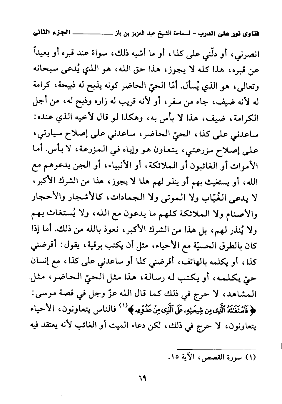 انصرني أو دلني على كذا، أو ما أشبه ذلك، سواء عند قبره أو بعيدا عن قبره، هذا كله لا يجوز، هذا حق الله، هو الذي يدعى سبحانه وتعالى، هو الذي يسأل؛ أما الحي الحاضر كونه يذبح له ذبيحة، كرامة له لأنه ضيف، جاء من سفر، أو لأنه قريب له زاره وذبح له، من أجل الكرامة، ضيف، هذا لا بأس به، وهكذا لو قال لأخيه الذي عنده: ساعدني على كذا، الحي الحاضر، ساعدني على إصلاح سيارتي، على إصلاح مزرعتي، يتعاون هو وإياه في المزرعة، لا بأس؛ أما الأموات أو الغائبون أو الملائكة، أو الأنبياء، أو الجن يدعوهم مع الله، أو يستغيث بهم أو ينذر لهم هذا لا يجوز، هذا من الشرك الأكبر، لا يدعى الغياب ولا الموتى ولا الجمادات، كالأشجار والأحجار والأصنام ولا الملائكة كلهم ما يدعون مع الله، ولا يستغاث بهم ولا ينذر لهم، بل هذا من الشرك الأكبر، نعوذ بالله من ذلك. أما إذا كان بالطرق الحسية مع الأحياء، مثل أن يكتب برقية، يقول: أقرضني كذا أو يكلمه بالهاتف، أقرضني كذا أو ساعدني على كذا، مع إنسان حي يكلمه، أو يكتب له رسالة، هذا مثل الحي الحاضر، مثل المشاهد، لا حرج في ذلك كما قال الله عز وجل في قصة موسى: {فَاسْتَغَاثَهُ الَّذِي مِنْ شِيعَتِهِ عَلَى الَّذِي مِنْ عَدُوِّهِ} (¬1) فالناس يتعاونون، الأحياء يتعاونون، لا حرج في ذلك، لكن دعاء الميت أو الغائب لأنه يعتقد فيه