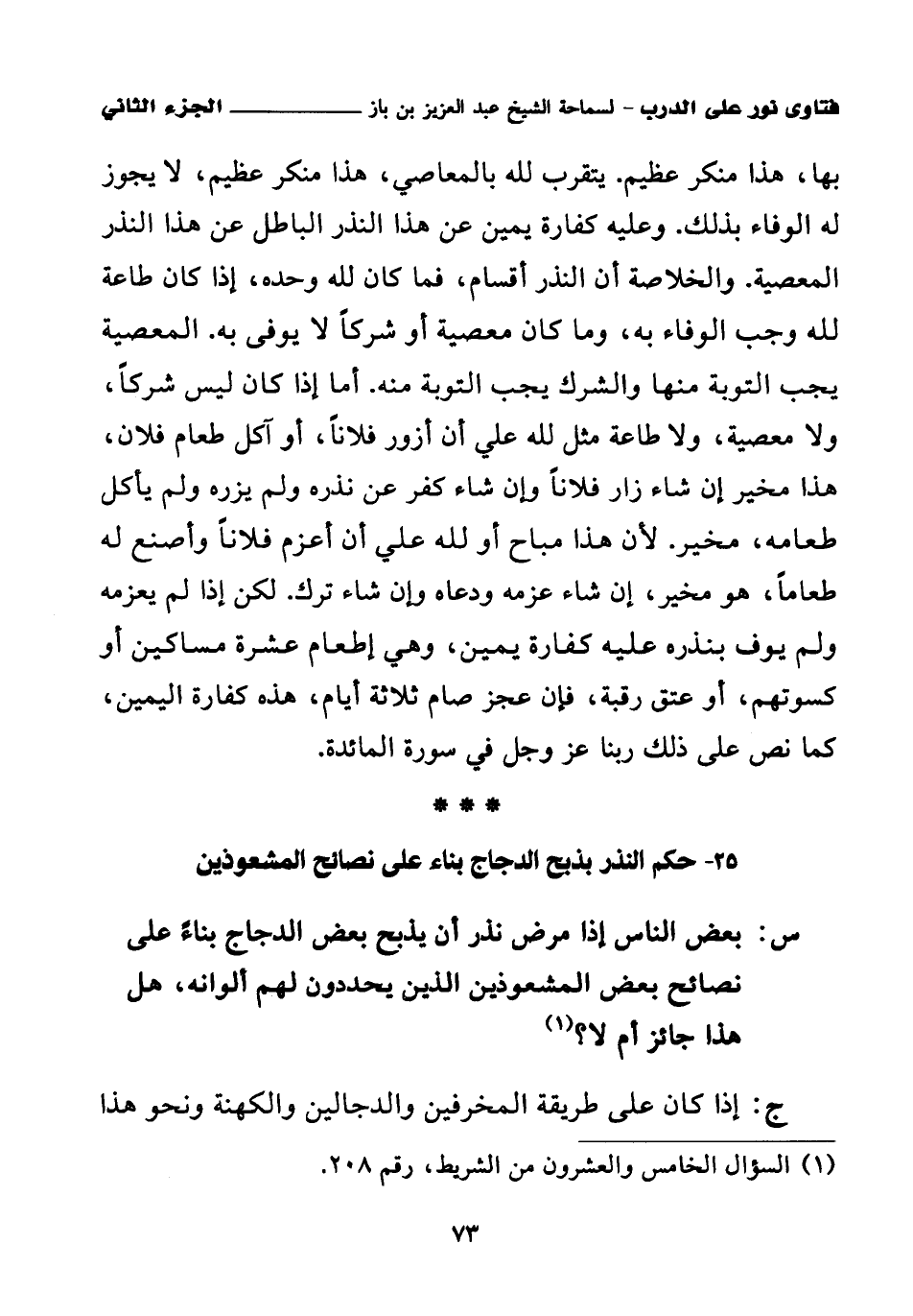 بها، هذا منكر عظيم. يتقرب لله بالمعاصي، هذا منكر عظيم، لا يجوز له الوفاء بذلك، وعليه كفارة يمين عن هذا النذر الباطل عن هذا النذر المعصية. والخلاصة أن النذر أقسام، فما كان لله وحده، إذا كان طاعة لله وجب الوفاء به، وما كان معصية أو شركا لا يوفى به. المعصية يجب التوبة منها والشرك يجب التوبة منه. أما إذا كان ليس شركا، ولا معصية، ولا طاعة مثل لله علي أن أزور فلانا، أو آكل طعام فلان، هذا مخير إن شاء زار فلانا وإن شاء كفر عن نذره ولم يزره ولم يأكل طعامه، مخير؛ لأن هذا مباح أو لله علي أن أعزم فلانا، أو أصنع له طعاما، هو مخير، إن شاء عزمه ودعاه وإن شاء ترك. لكن إذا لم يعزمه ولم يوف بنذره عليه كفارة يمين، وهي إطعام عشرة مساكين أو كسوتهم، أو عتق رقبة، فإن عجز صام ثلاثة أيام، هذا كفارة اليمين، كما نص على ذلك ربنا عز وجل في سورة المائدة.