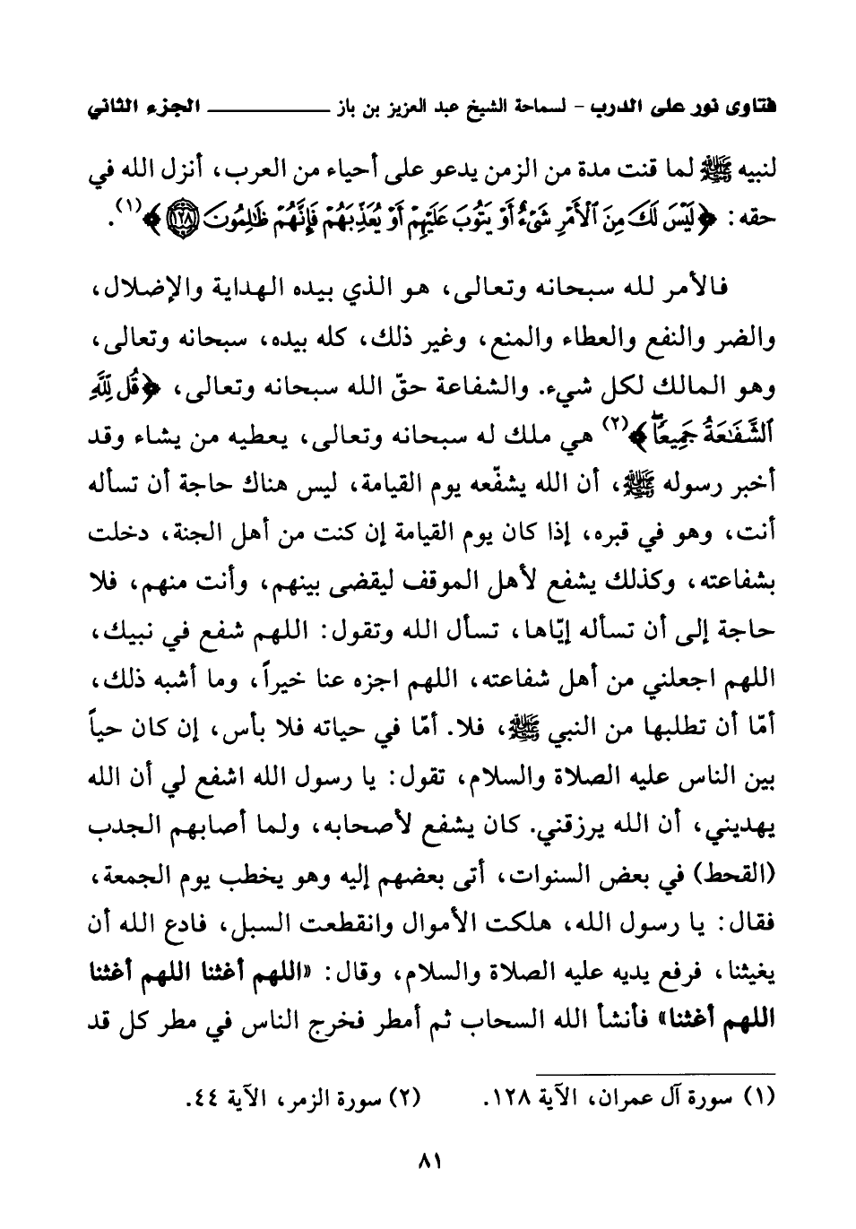 فالأمر لله سبحانه وتعالى، هو الذي بيده الهداية والإضلال، والضر والنفع والعطاء والمنع، وغير ذلك، كله بيده، سبحانه وتعالى، وهو المالك لكل شيء والشفاعة حق الله سبحانه وتعالى، {قُلْ لِلَّهِ الشَّفَاعَةُ جَمِيعًا} (¬2) هي ملك له سبحانه وتعالى، يعطيه من يشاء وقد أخبر رسوله - صلى الله عليه وسلم -، أن الله يشفعه يوم القيامة، ليس هناك حاجة أن تسأله أنت، وهو في قبره، إذا كان يوم القيامة، إن كنت من أهل الجنة، دخلت بشفاعته، وكذلك يشفع لأهل الموقف ليقضى بينهم، وأنت منهم، فلا حاجة إلى أن تسأله إياها، تسأل الله وتقول: اللهم شفع في نبيك، اللهم اجعلني من أهل شفاعته، اللهم اجزه عنا خيرا، وما أشبه ذلك، أما أن تطلبها من النبي - صلى الله عليه وسلم -، فلا. أما في حياته فلا بأس، إن كان حيا بين الناس عليه الصلاة والسلام، تقول: يا رسول الله اشفع لي أن الله يهديني، أن الله يرزقني. كان يشفع لأصحابه، ولما أصابهم الجدب (القحط) في بعض السنوات، أتى بعضهم إليه وهو يخطب يوم الجمعة، فقال: يا رسول الله، هلكت الأموال وانقطعت السبل، فادع الله أن يغيثنا، فرفع يديه عليه الصلاة والسلام، وقال: «اللهم أغثنا اللهم أغثنا اللهم أغثنا (¬3)»؛ فأنشأ الله السحاب ثم أمطر فخرج الناس في مطر كل قد