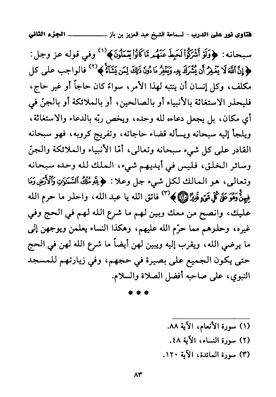 سبحانه: {وَلَوْ أَشْرَكُوا لَحَبِطَ عَنْهُمْ مَا كَانُوا يَعْمَلُونَ} (¬1) وفي قوله عز وجل: {إِنَّ اللَّهَ لَا يَغْفِرُ أَنْ يُشْرَكَ بِهِ وَيَغْفِرُ مَا دُونَ ذَلِكَ لِمَنْ يَشَاءُ} (¬2)، فالواجب على كل مكلف، وكل إنسان أن ينتبه لهذا الأمر، سواء كان حاجا أو غير حاج، فليحذر الاستغاثة بالأنبياء أو بالصالحين، أو بالملائكة أو بالجن في أي مكان، بل يجعل دعاءه لله وحده، ويخص ربه بالدعاء والاستغاثة، ويلجأ إليه سبحانه ويسأله قضاء حاجاته، وتفريج كروبه، فهو سبحانه القادر على كل شيء سبحانه وتعالى، أما الأنبياء والملائكة والجن وسائر الخلق، فليس في أيديهم شيء، الملك لله وحده سبحانه وتعالى، هو المالك لكل شيء جل وعلا: {لِلَّهِ مُلْكُ السَّمَاوَاتِ وَالْأَرْضِ وَمَا فِيهِنَّ وَهُوَ عَلَى كُلِّ شَيْءٍ قَدِيرٌ} (¬3) فاتق الله يا عبد الله، واحذر ما حرم الله عليك، وانصح من معك وبين لهم ما شرع الله لهم في الحج وفي غيره، وحذرهم مما حرم الله عليهم، وهكذا النساء يعلمن ويوجهن إلى ما يرضي الله، ويقرب إليه ويبين لهن أيضا ما شرع الله لهن في الحج حتى يكون الجميع على بصيرة في حجهم، وفي زيارتهم للمسجد النبوي، على صاحبه أفضل الصلاة والسلام.