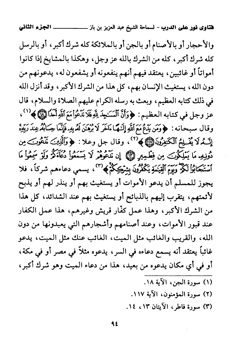 والأحجار أو بالأصنام أو بالجن أو بالملائكة، كله شرك أكبر، أو بالرسل كله شرك أكبر، كله من الشرك بالله عز وجل، وهكذا بالمشايخ إذا كانوا أمواتا أو غائبين، يعتقد فيهم أنهم ينفعونه أو يشفعون له، يدعونهم من دون الله، يستغيث الإنسان بهم، كل هذا من الشرك الأكبر، وقد أنزل الله في ذلك كتابه العظيم، وبعث به رسله الكرام عليهم الصلاة والسلام، قال عز وجل في كتابه العظيم: {وَأَنَّ الْمَسَاجِدَ لِلَّهِ فَلَا تَدْعُوا مَعَ اللَّهِ أَحَدًا} (¬1)، وقال سبحانه: {وَمَنْ يَدْعُ مَعَ اللَّهِ إِلَهًا آخَرَ لَا بُرْهَانَ لَهُ بِهِ فَإِنَّمَا حِسَابُهُ عِنْدَ رَبِّهِ إِنَّهُ لَا يُفْلِحُ الْكَافِرُونَ} (¬2)، وقال جل وعلا: {وَالَّذِينَ تَدْعُونَ مِنْ دُونِهِ مَا يَمْلِكُونَ مِنْ قِطْمِيرٍ} (¬3) {إِنْ تَدْعُوهُمْ لَا يَسْمَعُوا دُعَاءَكُمْ وَلَوْ سَمِعُوا مَا اسْتَجَابُوا لَكُمْ وَيَوْمَ الْقِيَامَةِ يَكْفُرُونَ بِشِرْكِكُمْ} (¬4) يسمي دعاءهم شركا، فلا يجوز للمسلم أن يدعو الأموات أو يستغيث بهم أو ينذر لهم أو يذبح لأئمتهم، يتقرب إليهم بالذبائح أو يستغيث بهم عند الشدائد، كل هذا من الشرك الأكبر، وهذا عمل كفار قريش وغيرهم، هذا عمل الكفار عند قبور الأموات، وعند أصنامهم وأشجارهم التي يعبدونها من دون الله، والقريب والغائب مثل الميت، الغائب عنك مثل الميت، يدعو غائبا يعتقد أنه يسمع دعاءه في السر، يدعوه مثلا في مصر أو في مكة، أو في أي مكان يدعوه من بعيد، هذا من دعاء الميت وهو شرك أكبر،