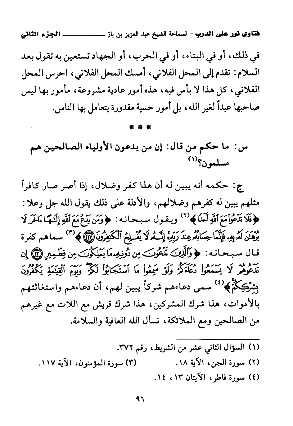ج: حكمه أنه يبين له أن هذا كفر وضلال، إذا أصر صار كافرا مثلهم يبين له كفرهم وضلالهم، والأدلة على ذلك يقول الله جل وعلا: {فَلَا تَدْعُوا مَعَ اللَّهِ أَحَدًا} (¬2)، ويقول سبحانه: {وَمَنْ يَدْعُ مَعَ اللَّهِ إِلَهًا آخَرَ لَا بُرْهَانَ لَهُ بِهِ فَإِنَّمَا حِسَابُهُ عِنْدَ رَبِّهِ إِنَّهُ لَا يُفْلِحُ الْكَافِرُونَ} (¬3) سماهم كفرة؛ قال سبحانه: {وَالَّذِينَ تَدْعُونَ مِنْ دُونِهِ مَا يَمْلِكُونَ مِنْ قِطْمِيرٍ} (¬4) {إِنْ تَدْعُوهُمْ لَا يَسْمَعُوا دُعَاءَكُمْ وَلَوْ سَمِعُوا مَا اسْتَجَابُوا لَكُمْ وَيَوْمَ الْقِيَامَةِ يَكْفُرُونَ بِشِرْكِكُمْ} (¬5) سمى دعاءهم شركا يبين لهم، أن دعاءهم واستغاثتهم بالأموات، هذا شرك المشركين، هذا شرك قريش مع اللات مع غيرهم من الصالحين ومع الملائكة، نسأل الله العافية والسلامة.