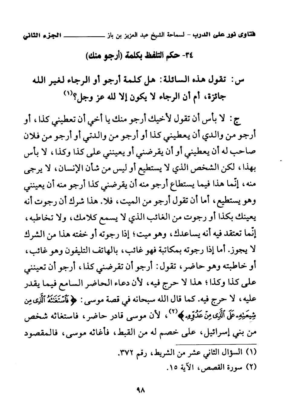 ج: لا بأس أن تقول لأخيك: أرجو منك يا أخي أن تعطيني كذا، أو أرجو من والدي أن يعطيني كذا أو أرجو من والدتي أو أرجو من فلان صاحب له أن يعطيني أو أن يقرضني أو يعينني على كذا وكذا، لا بأس بهذا، لكن الشخص الذي لا يستطيع أو ليس من شأن الإنسان، لا يرجى منه، إنما هذا فيما يستطاع أرجو منه أن يقرضني كذا أرجو منه أن يعينني وهو يستطيع، أما أن تقول أرجو من الميت، فلا. هذا شرك أن رجوت أنه يعينك بكذا أو رجوت من الغائب الذي لا يسمع كلامك، ولا تخاطبه، إنما تعتقد فيه أنه يساعدك، وهو ميت؛ إذا رجوته أو خفته هذا من الشرك لا يجوز. أما إذا رجوته بمكاتبة وهو غائب، بالهاتف التليفون وهو غائب، أو خاطبته وهو حاضر، تقول: أرجو أن تقرضني كذا، أرجو أن تعينني على كذا وكذا؛ هذا لا حرج فيه، لأن دعاء الحاضر السامع فيما يقدر عليه، لا حرج فيه. كما قال الله سبحانه في قصة موسى: {فَاسْتَغَاثَهُ الَّذِي مِنْ شِيعَتِهِ عَلَى الَّذِي مِنْ عَدُوِّهِ} (¬2)؛ لأن موسى قادر حاضر، فاستغاثه شخص من بني إسرائيل، على خصم له من القبط، فأغاثه موسى، فالمقصود