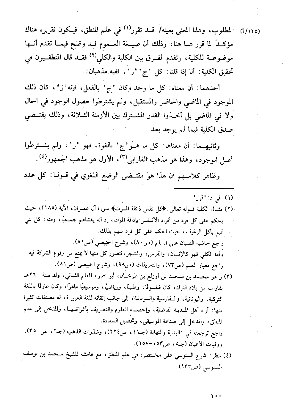 المطلوب، وهذا المعنى بعينه/ قد تقرر في علم المنطق، فيكون تقريره هناك مؤكدًا لما قرر ها هنا، وذلك أن صيغة العموم قد وضح فيما تقدم أنها موضوعة للكلية، وتقدم الفرق بين الكلية والكلي فقد قال المنطقيون في تحقيق الكلية: أنا إذا قلنا: كل "ج" "ر"، ففيه مذهبان: