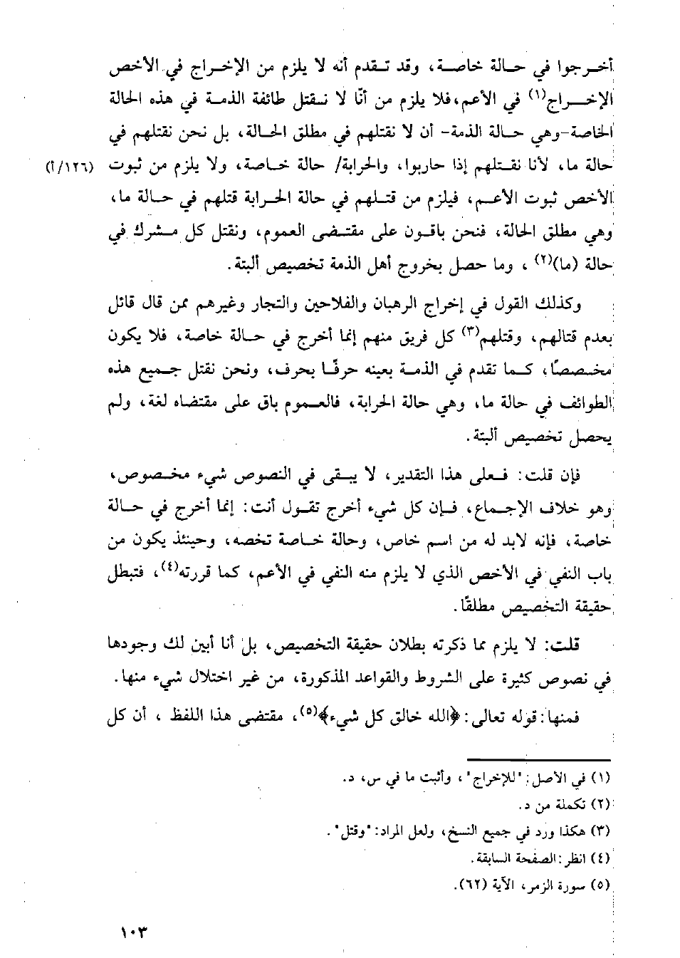 وكذلك القول في إخراج الرهبان والفلاحين والتجار وغيرهم ممن قال قائل بعدم قتالهم، وقتلهم كل فريق منهم إنما أخرج في حالة خاصة، فلا يكون مخصصًا، كما تقدم في الذمة بعينه حرفًا بحرف، ونحن نقتل جميع هذه الطوائف في حالة ما، وهي حالة الحرابة، فالعموم باق على مقتضاه لغة، ولم يحصل تخصيص ألبتة.