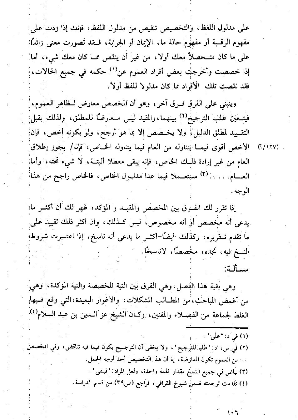 وهي بقية هذا الفصل، وهي الفرق بين النية المخصصة والنية المؤكدة، وهي من أغمض المباحث، من المطالب المشكلات، والأغوار البعيدة، التي وقع فيها الغلط لجماعة من الفضلاء والمفتين، وكان الشيخ عز الدين بن عبد السلام