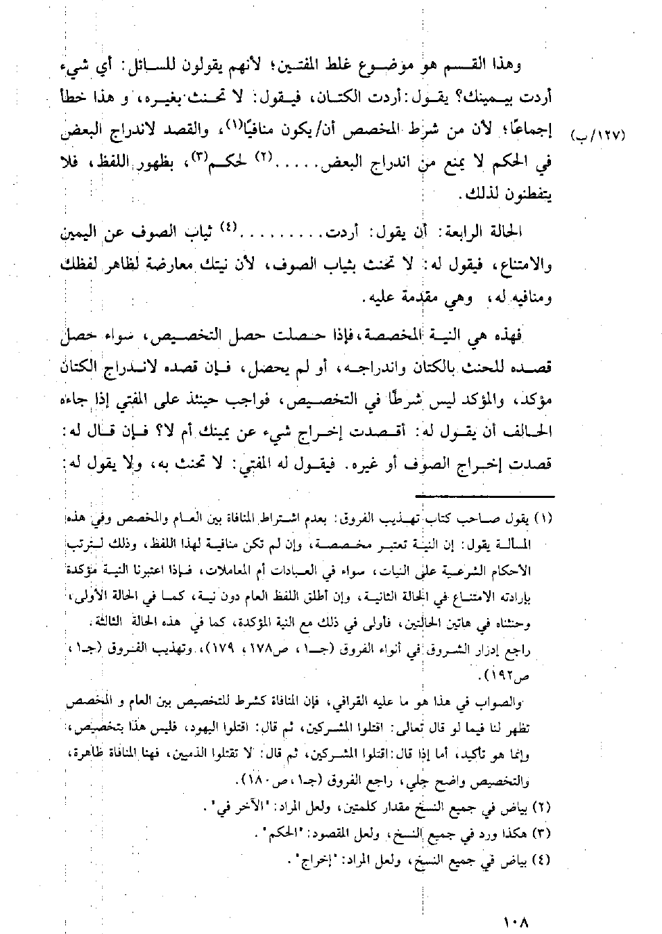 فهذه هي النية المخصصة، فإذا حصلت حصل التخصيص، سواء حصل قصده للحنث بالكتان واندراجه، أو لم يحصل، فإن قصده لاندراج الكتان مؤكد، والمؤكد ليس شرطًا في التخصيص، فواجب حينئذ على المفتي إذا جاءه الحالف أن يقول له: أقصدت إخراج شيء عن يمينك أم لا؟ فإن قال له: قصدت إخراج الصوف أو غيره. فيقول له المفتي: لا تحنث به، ولا يقول له: