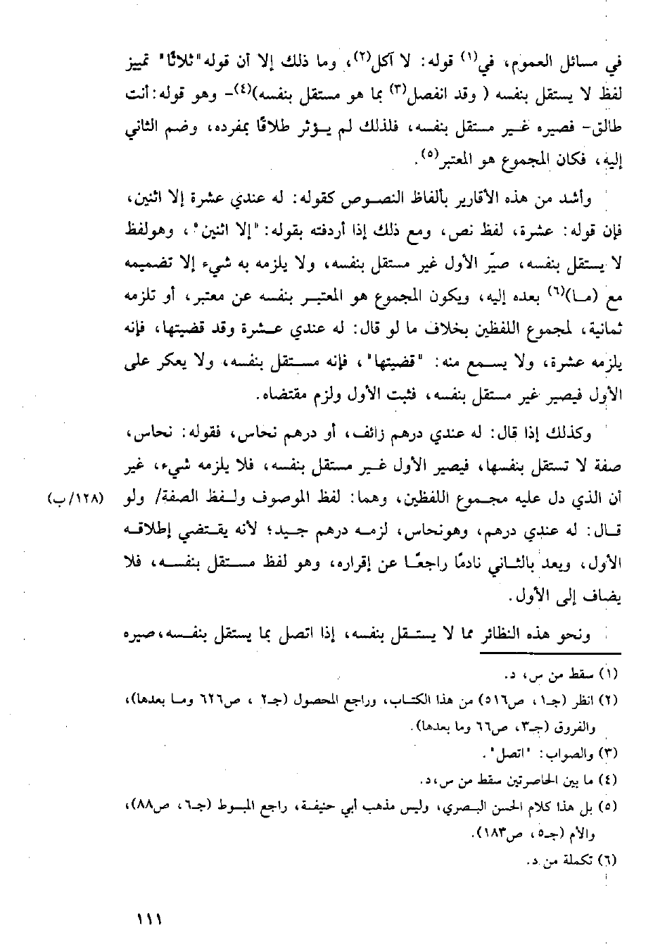 في مسائل العموم، في قوله: لا آكل، وما ذلك إلا أن قوله "ثلاثًا تمييز لفظ لا يستقل بنفسه (وقد انفصل بما هو مستقل بنفسه) - وهو قوله: أنت طالق - فصيره غير مستقل بنفسه، فلذلك لم يؤثر طلاقًا بمفرده، وضم الثاني إليه، فكان المجموع هو المعتبر.