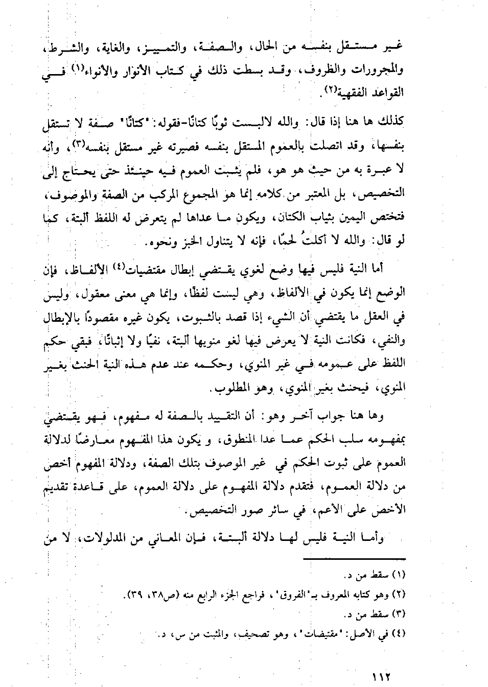 كذلك ها هنا إذا قال: والله لا لبست ثوبًا كتانًا - فقوله: "كتانًا" صفة لا تستقل بنفسها، وقد اتصلت بالعموم المستقل بنفسه فصيرته غير مستقل بنفسه، وأنه لا عبرة به من حيث هو هو، فلم يثبت العموم فيه حينئذ حتى يحتاج إلى التخصيص، بل المعتبر من كلامه إنما هو المجموع المركب من الصفة والموصوف، فتختص اليمين بثياب الكتان، ويكون ما عداها لم يتعرض له اللفظ ألبتة، كما لو قال: والله لا أكلت لحمًا، فإنه لا يتناول الخبز ونحوه.