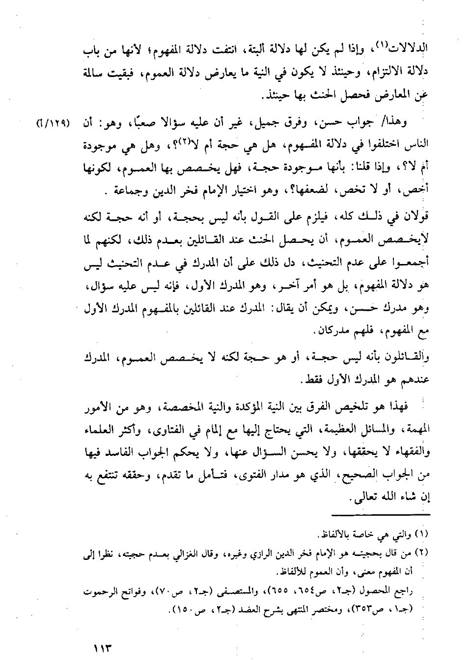 وهذا/ جواب حسن، وفرق جميل، غير أن عليه سؤالًا صعبًا، وهو: أن الناس اختلفوا في دلالة المفهوم، هل هي حجة أم لا؟ ، وهل هي موجودة أم لا؟ ، وإذا قلنا: بأنها موجودة حجة، فهل يخصص بها العموم، لكونها أخص، أو لا تخص، لضعفها؟ ، وهو اختيار الإمام فخر الدين وجماعة.